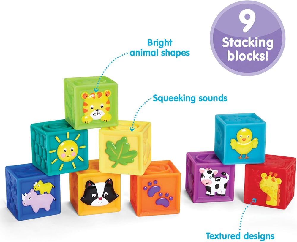 SOFT AND SAFE: The Squeak ‘N Stack Blocks are the perfect option if you want your baby to have blocks without the heavy and sharp traditional ones. They're soft enough to be squeezed, making a squeak sound, but also firm enough to be stacked easily atop one another.
