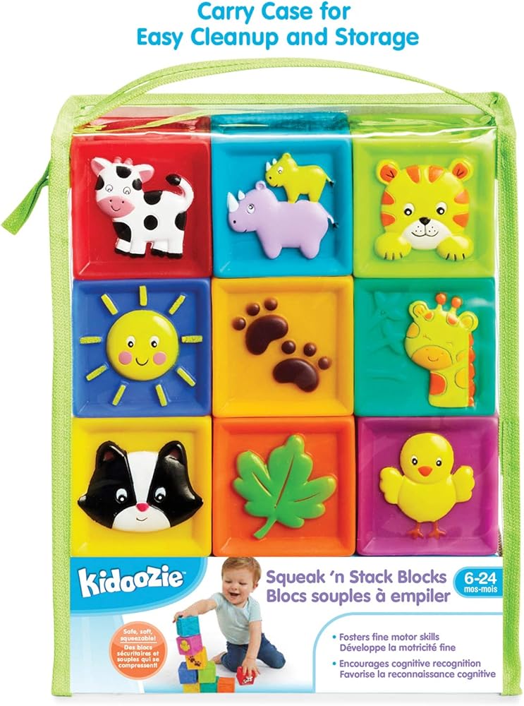 PRODUCT SPECIFICATIONS: Package contains (1) Earlyears Squeak ‘N Stack Blocks Set. Includes 9 soft squeaky blocks with embossed pictures. Made of phthalate free vinyl. Includes clean vinyl zippered pouch for easy storage and transportation. Suitable for babies ages 6 to 24 months.