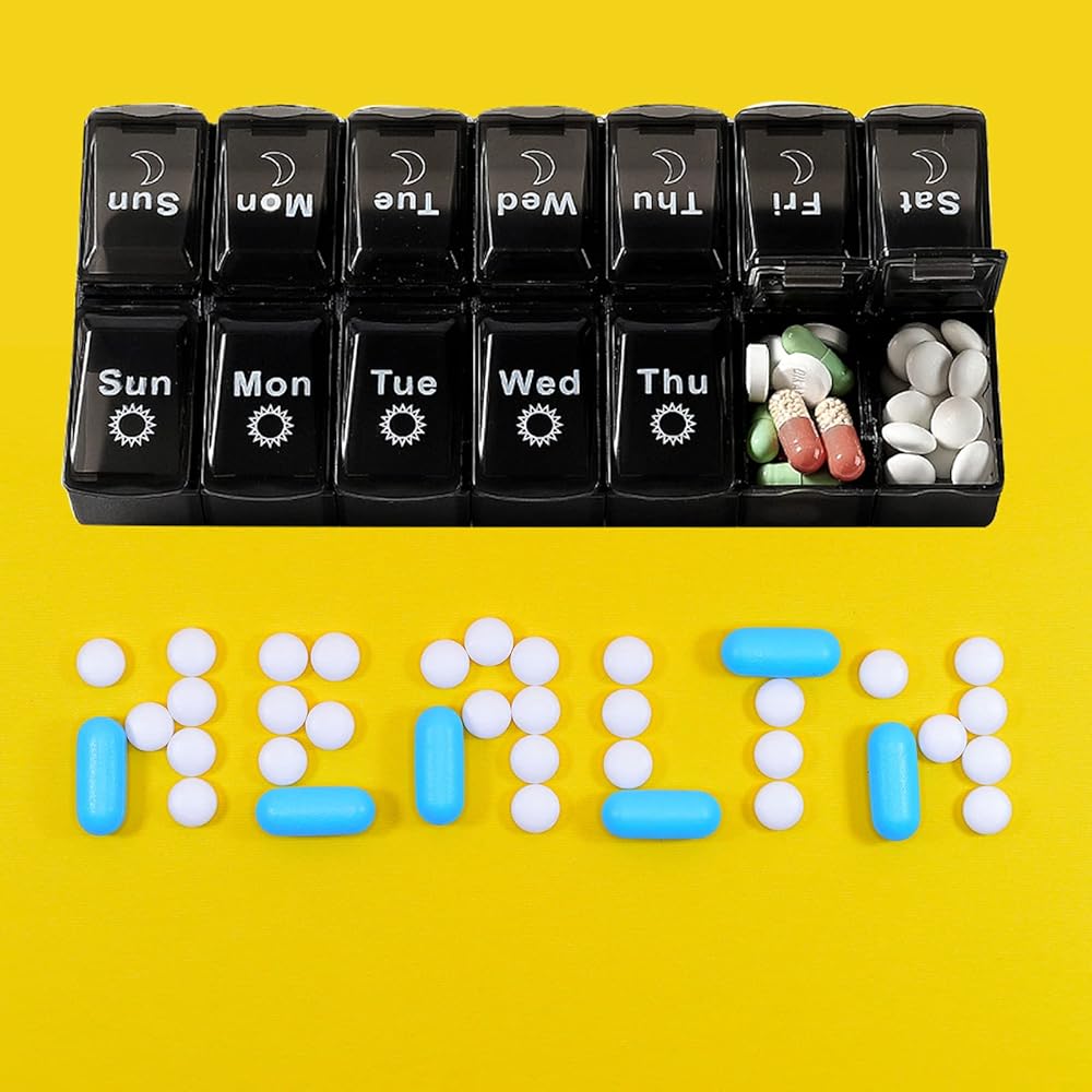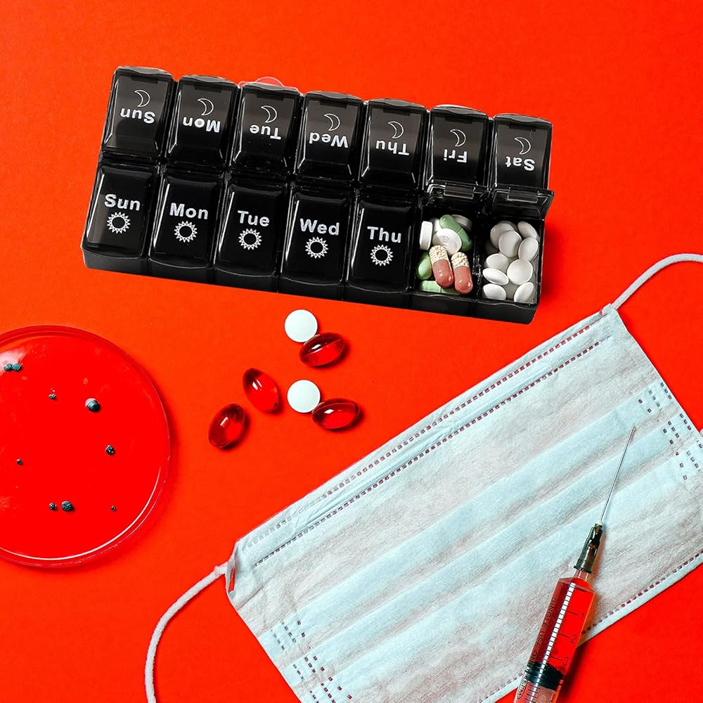 Material:Weekly pill organizer is made of high quality food grade plastic,non-toxic,with plastic lid,and marked clearly with the date,everything is clear at a glance.