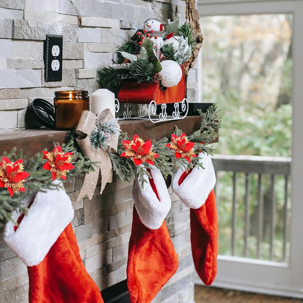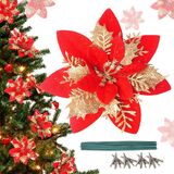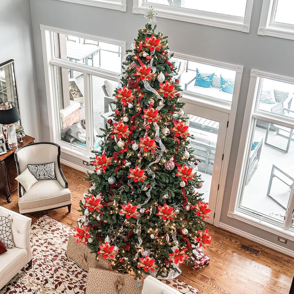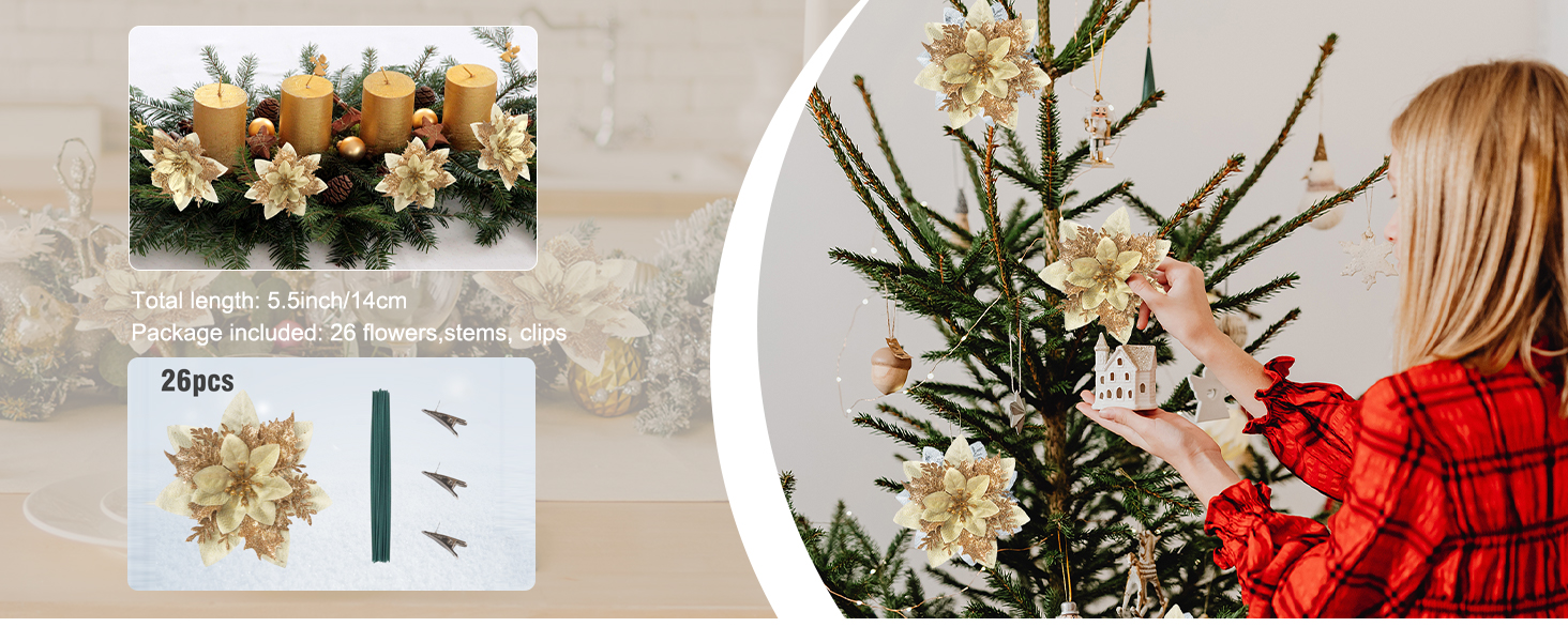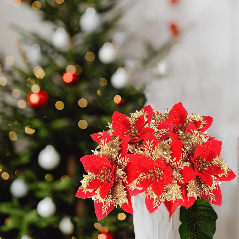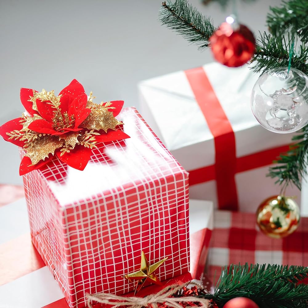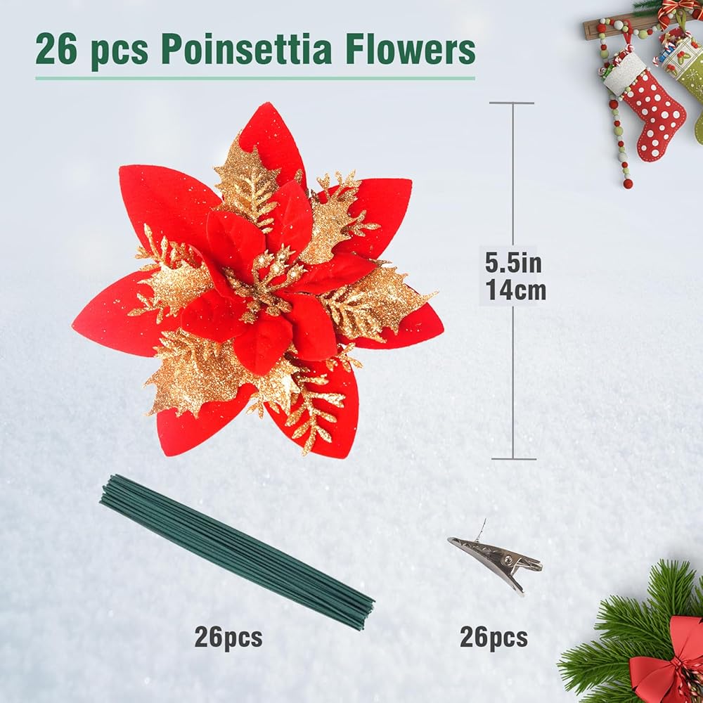 الحجم والعبوة - 26 قطعة من زهور البونسيتة اللامعة لكل قطعة. قطر رأس الزهرة حوالي 5.51 بوصة. أنها تأتي مع مقاطع وبخار لاحتياجات التزيين الخاصة بك.