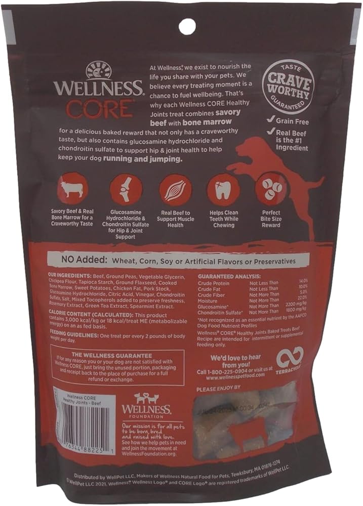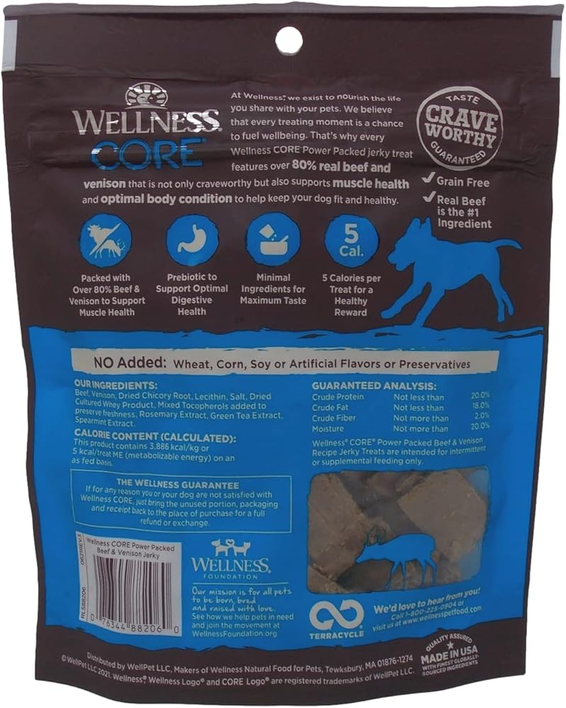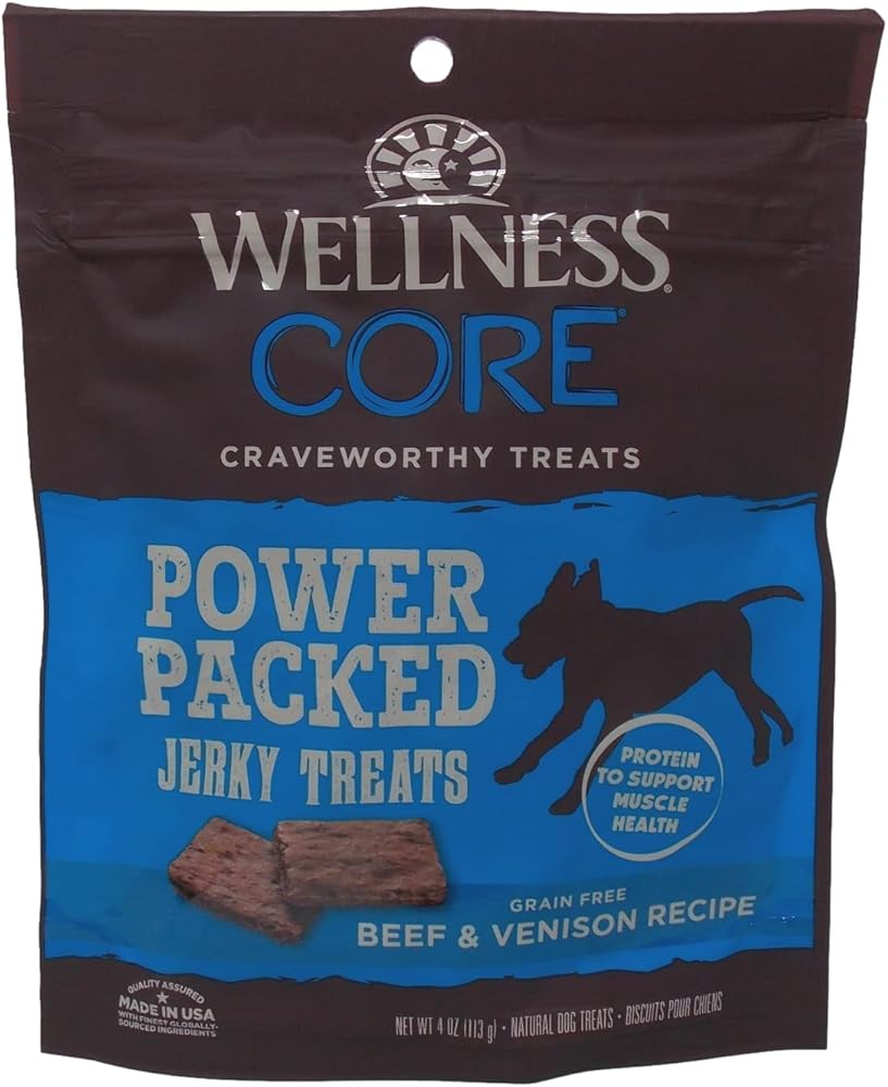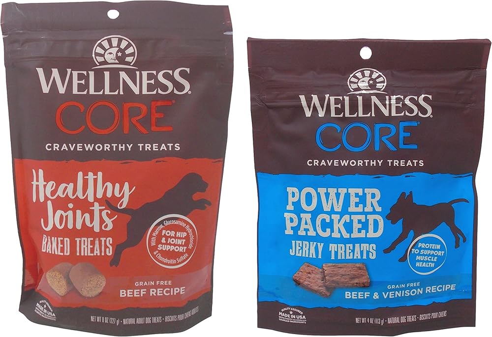 Bundle Includes: Wellness CORE Grain Free Dog Treats - 2 Flavor Variety Bundle: (1) Each: Healthy Joints Beef Chewy Baked, Power Packed Beef Venison Chewy Jerky (4-8 Ounces)