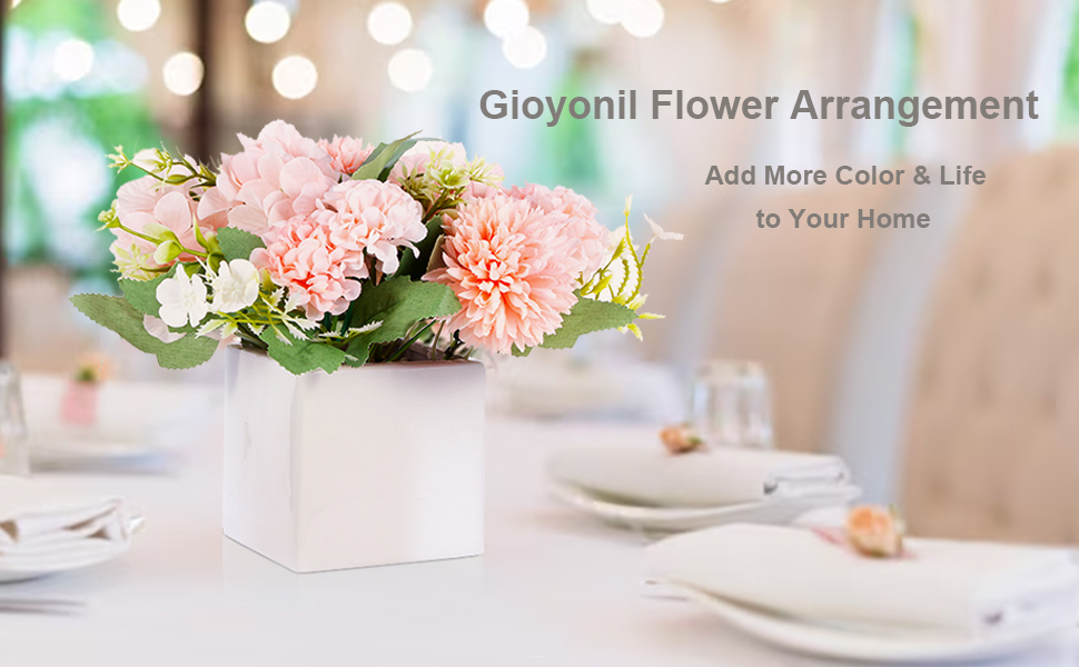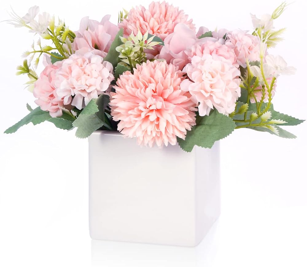 زهور Gioyonil المزيفة مع مزهرية سيراميك، ترتيبات زهور الفاوانيا الكوبية الوردية الصناعية في تزيين المزهرية لطاولة الطعام المركزية وديكور المنزل والمكتب وحفلات الزفاف