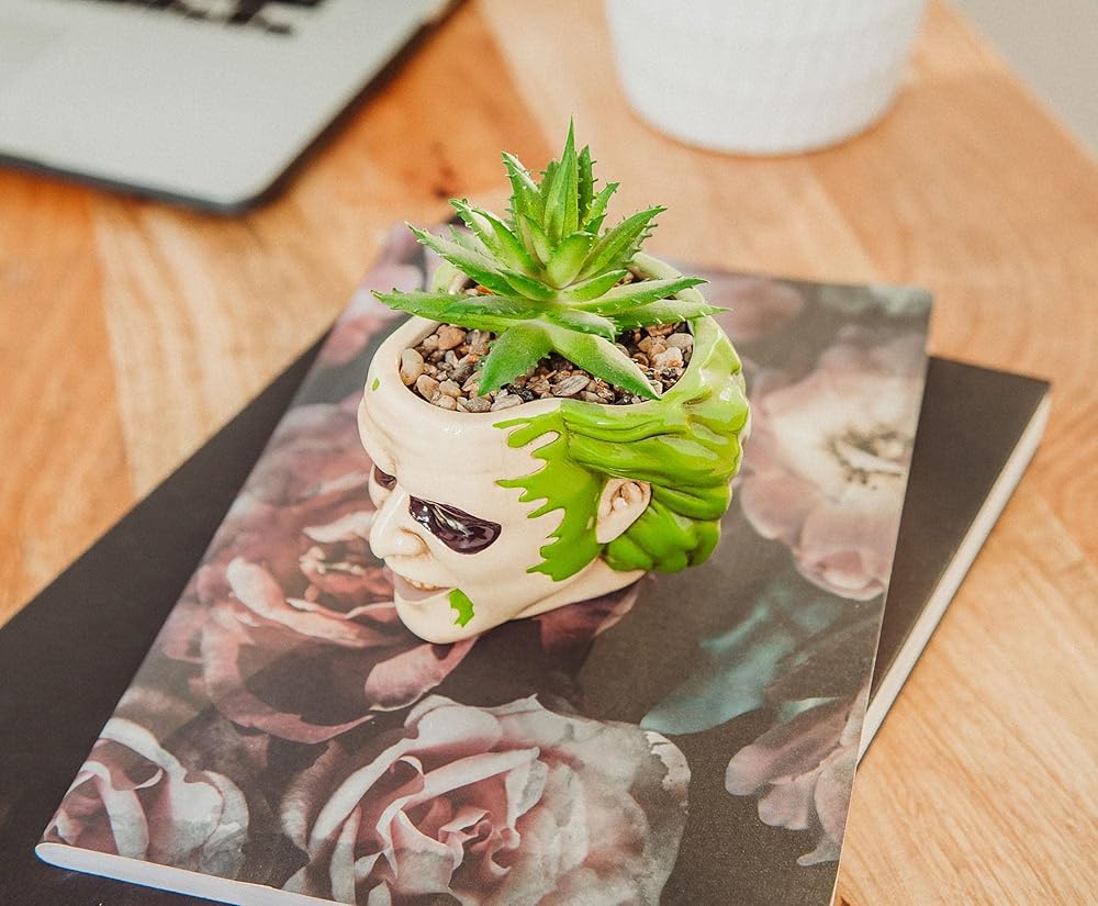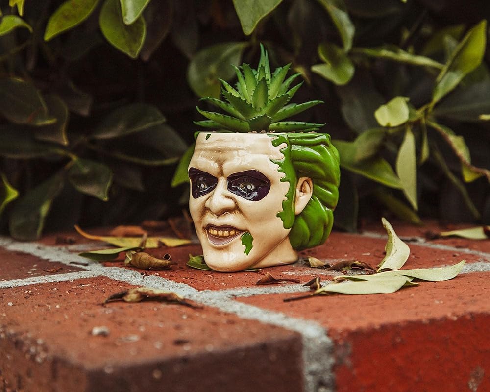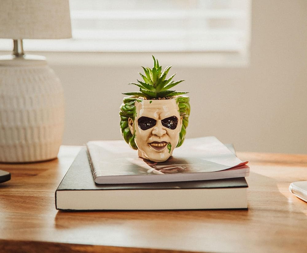 ازرع بذور الأناقة مع وعاء النباتات المصنوع من السيراميك بيتلجوس المرح. على شكل رأس الشبح مع أكثر من غيرها، يأتي هذا النبات مع نبات صناعي بحيث لا توجد صيانة ضرورية لجني المكافآت الأنيقة. يُعد هذا الوعاء طريقة رائعة لإضفاء إشراقة على أي منزل أو مكتب أو غرفة استراحة في مكان العمل. مرخصة رسميًا. حصري من توينك تويز.