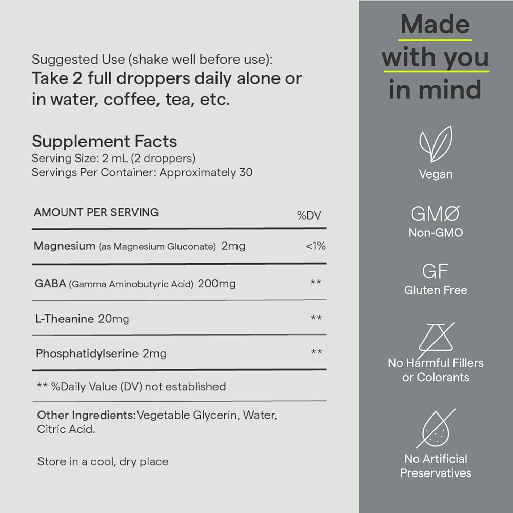 يعزز الشعور بالهدوء ويدعم الإدراك العقلي مع مزيج قوي من غابا والثيانين والمغنيسيوم. يمكن أن تتأثر قدرتك على التركيز بالضغوط اليومية، وهذا هو السبب في أننا ابتكرنا قطرات التركيز الخاصة بنا، وهو مكمل غذائي سائل معرفي، لمساعدتك على الشعور بمزيد من الهدوء والاسترخاء أثناء قيامك بالمهمة التي تقوم بها. * مكمل غذائي لدعم المزاج: يساعدك جابا على الشعور بمزيد من الهدوء والاسترخاء في اللحظة التي تتعامل فيها مع الضغوطات اليومية التي تؤثر على قدرتك على التركيز. * مصنوع أيضًا من مكونات داعمة، بما في ذلك مكمل الثيانين وفوسفاتيديل سيرين ومكملات المغنيسيوم. بدون نكهة إضافية. قطرات مكملات داعمة للدماغ - تستغرق لمدة 30 يومًا على الأقل للحصول على أفضل النتائج.