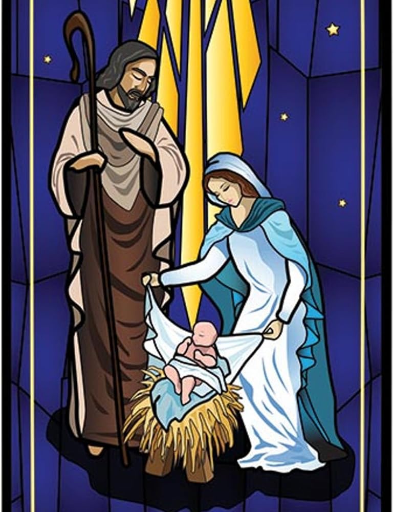 Stained Glass Design: Enjoy full-color stained glass-style art showcasing a simple Nativity scene on durable vinyl.