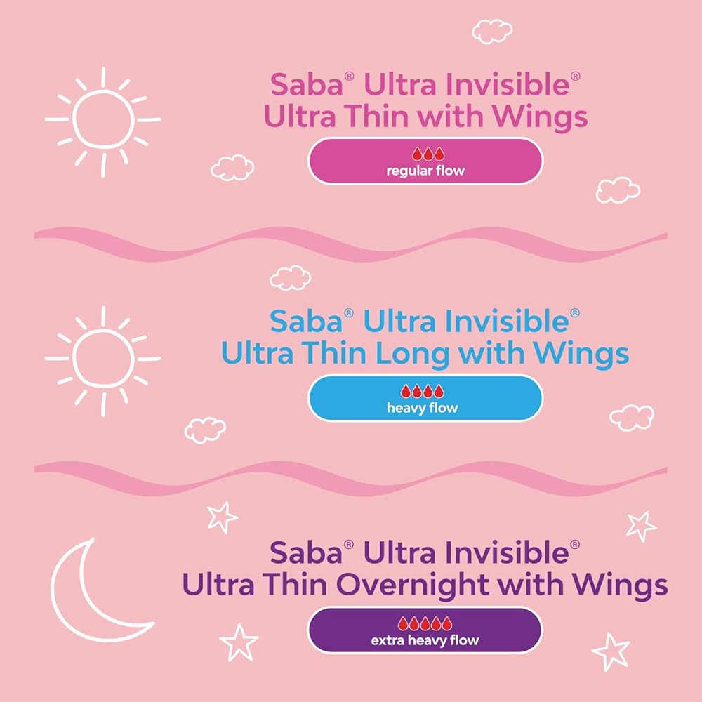 امتصاص فائق: تتميز بتقنية الامتصاص الفائق التي توفر امتصاصًا وتوزيعًا سريعًا يحبس السوائل، وتوفر وسادات سابا الأنثوية غير المرئية للغاية والرقيقة للغاية الحماية القصوى للتدفق الثقيل الإضافي