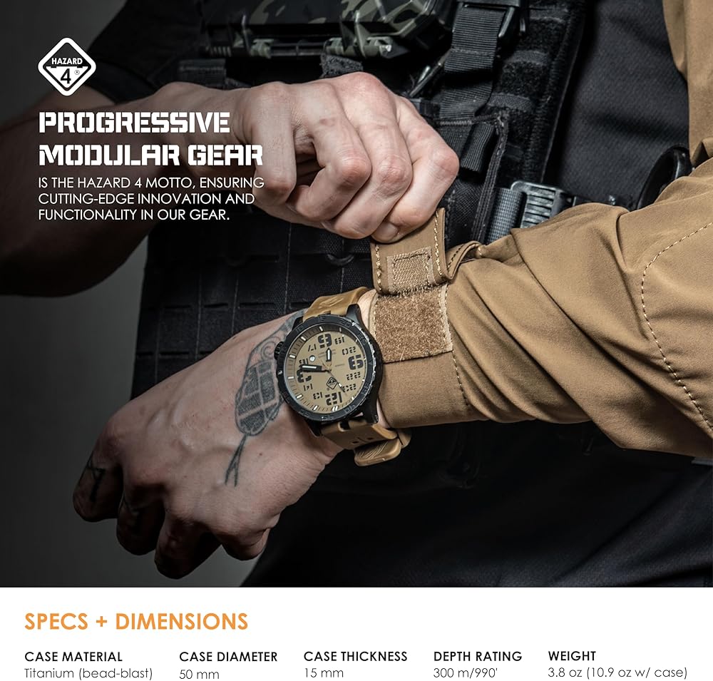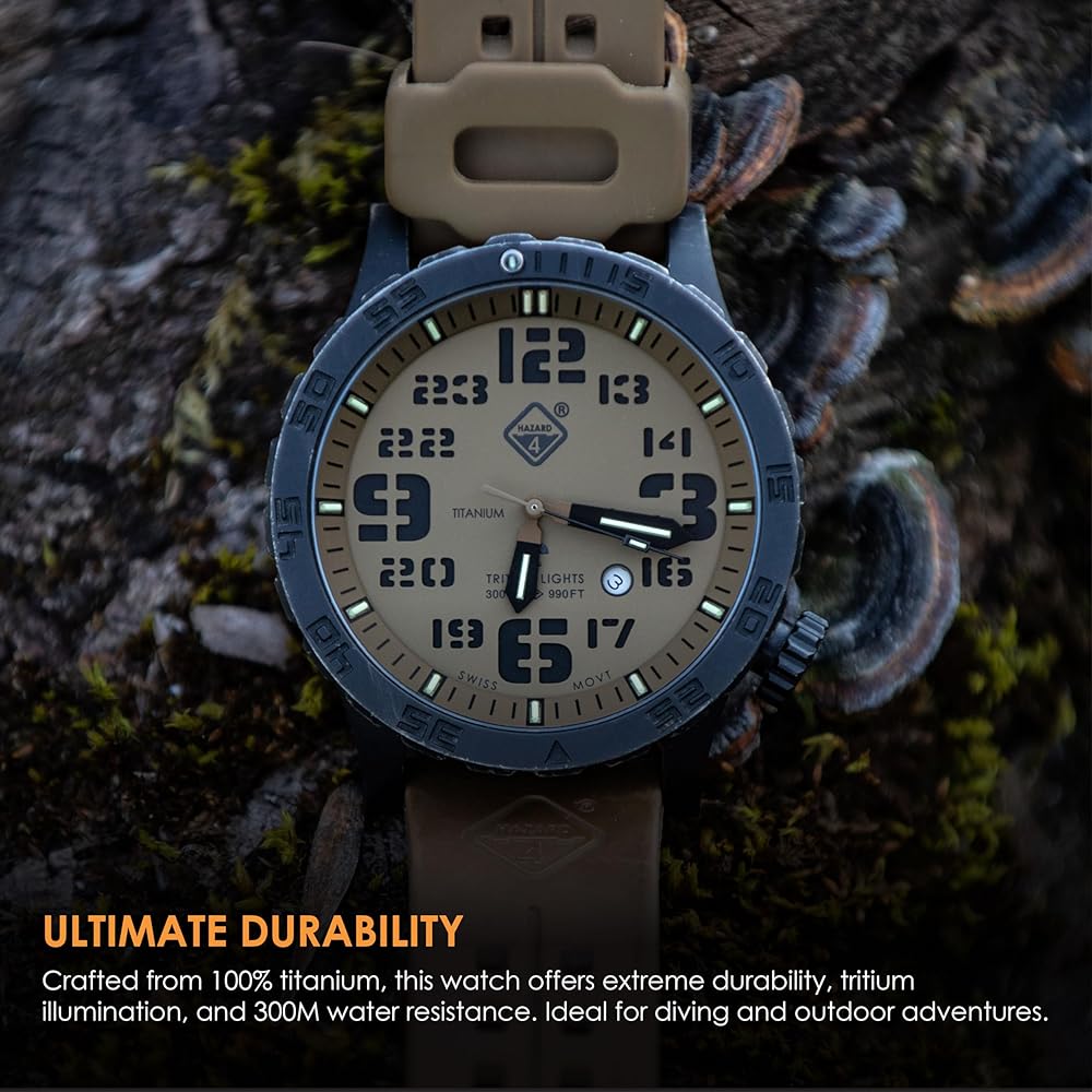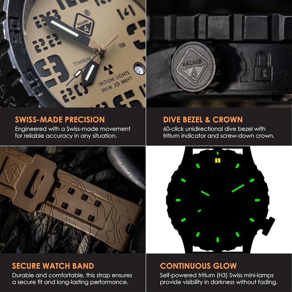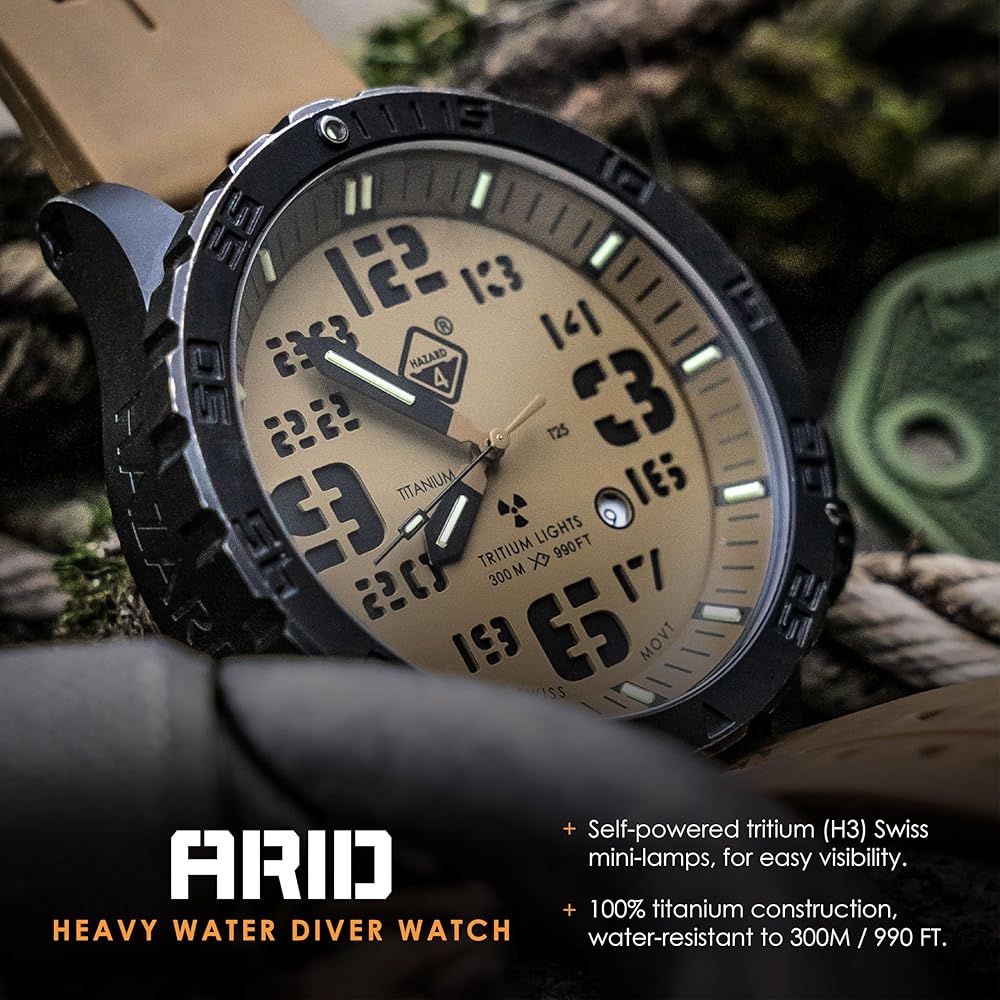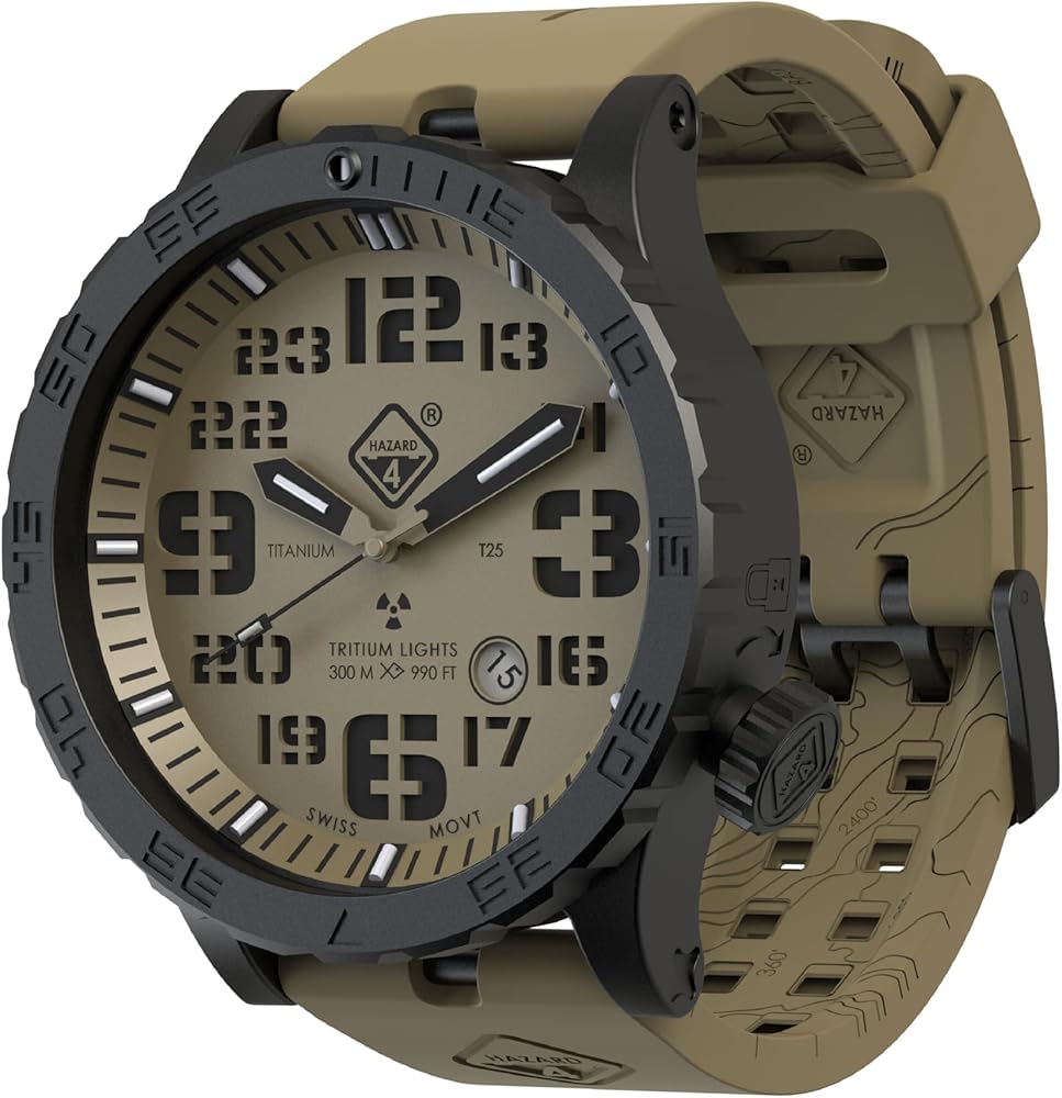 Hazard 4(R) Heavy Water Diver(R) watches glow continuously using self-powered tritium (H3) Swiss mini-lamps like in your pistol night sights - won't fade overnight like lume paint. Built with 100% titanium, this 50mm large watch is only 1/2 the weight, but double the strength of a steel watch. A proven dive watch, it is water resistant to 300M / 990 FT depth. The unique, bold, military styling features easy-to-read numerals and our exclusive integrated 24-hour scale. The submarine-inspired aesthetics carry into the precision, 60-click uni-directional dive bezel topped with tritium zero indicator and the easy-turn screw-down crown. The face numerals are 3D stencil 2-layer design which along with angled chapter ring makes it not only tactical, but also a sophisticated timepiece suitable for the office or formal event. Available in an unprecedented range of tactical and urban oriented colors/finishes - they come equipped with a variety of straps and bracelets. Used in the most extreme environments by special forces, explorers, and professionals worldwide, it won't let you down and makes an unforgettable formal present.