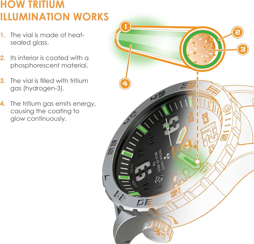 • Self-contained everglow tritium-vial lamps; Titanium case is light, strong, and hypoallergenic; High water resistance feature set.