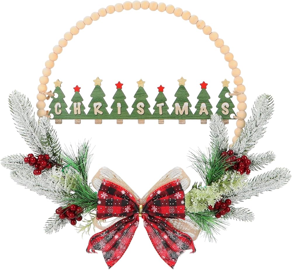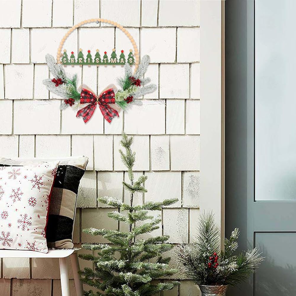 CHDITB 17 بوصة اصطناعية عيد الميلاد الخشب حبة إكليل، خشبية شجرة عيد الميلاد علامة الباب مع الأحمر منقوشة القوس التوت الصنوبر الإبر ورقة هولي، ريفي إكليل عيد الميلاد للباب الأمامي نافذة الشرفة حفلة الشتاء