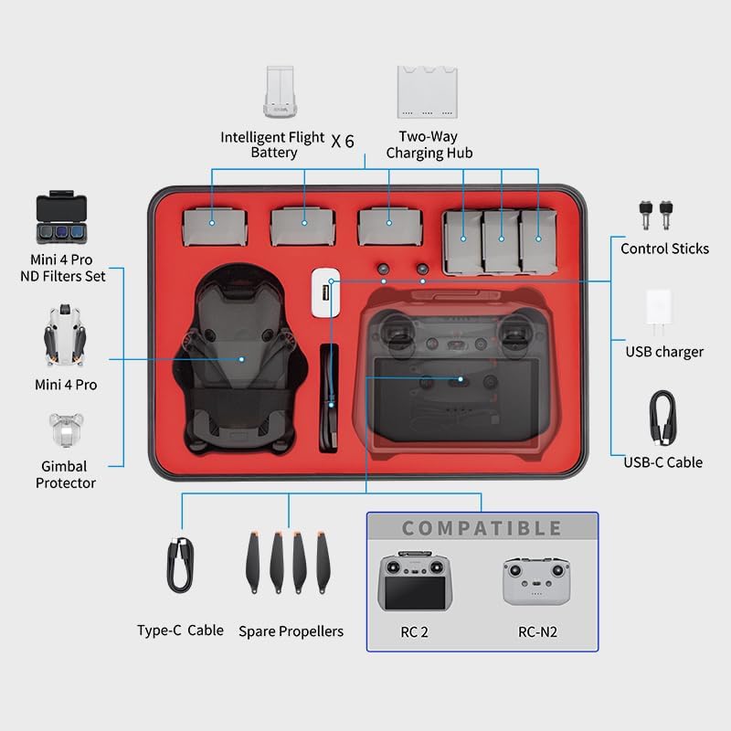 【سعة كبيرة】يمكن أن تستوعب حافظة ميني 4 برو الخاصة بنا ما يلي: 1 × طائرة درون ميني 4 برو، 1 × جهاز تحكم عن بعد RC2 أو N2، 1 × حامل مروحة ميني 4 برو، 1 × بطارية طيران ذكية، 1 × واقي جيمبال ميني 4 برو، 1 × كيبل بي دي نوع سي إلى نوع سي، مراوح احتياطية، براغي احتياطية، مفك براغي والمزيد من الملحقات.