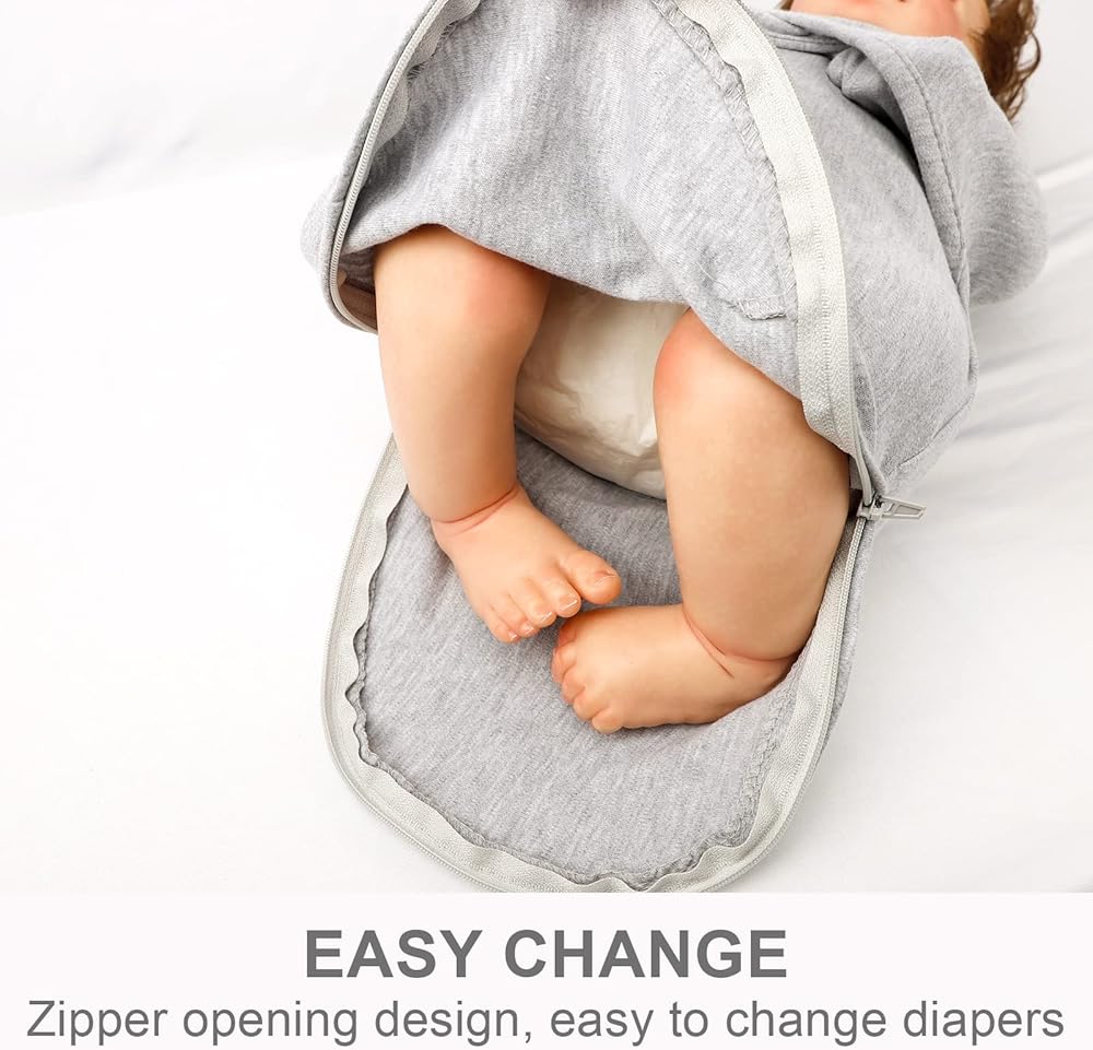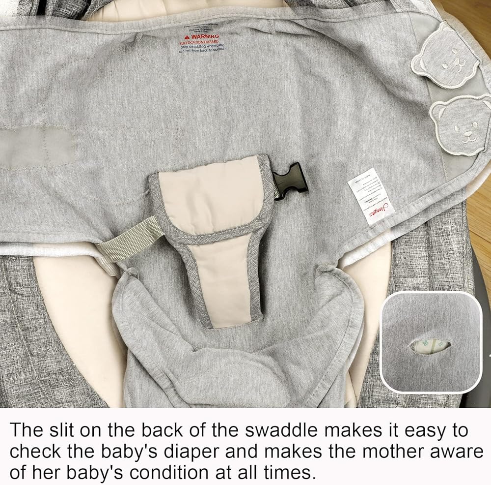 القميط سهل - الجزء السفلي من بطانية القميط المكونة من 3 قطع يتميز بتصميم فتحة بسحاب، مما يسهل تغيير الحفاضات. الشقوق الموجودة على الجزء الخلفي من القماط مخصصة للاستخدام في الأراجيح والقفز. من فضلك لا تستخدم في مقاعد السيارة الرضع.