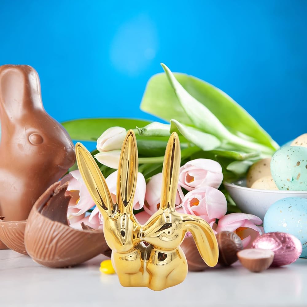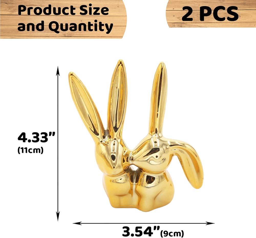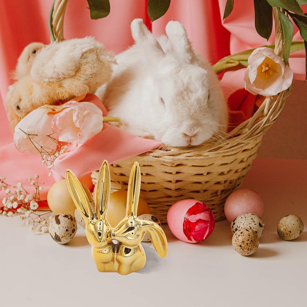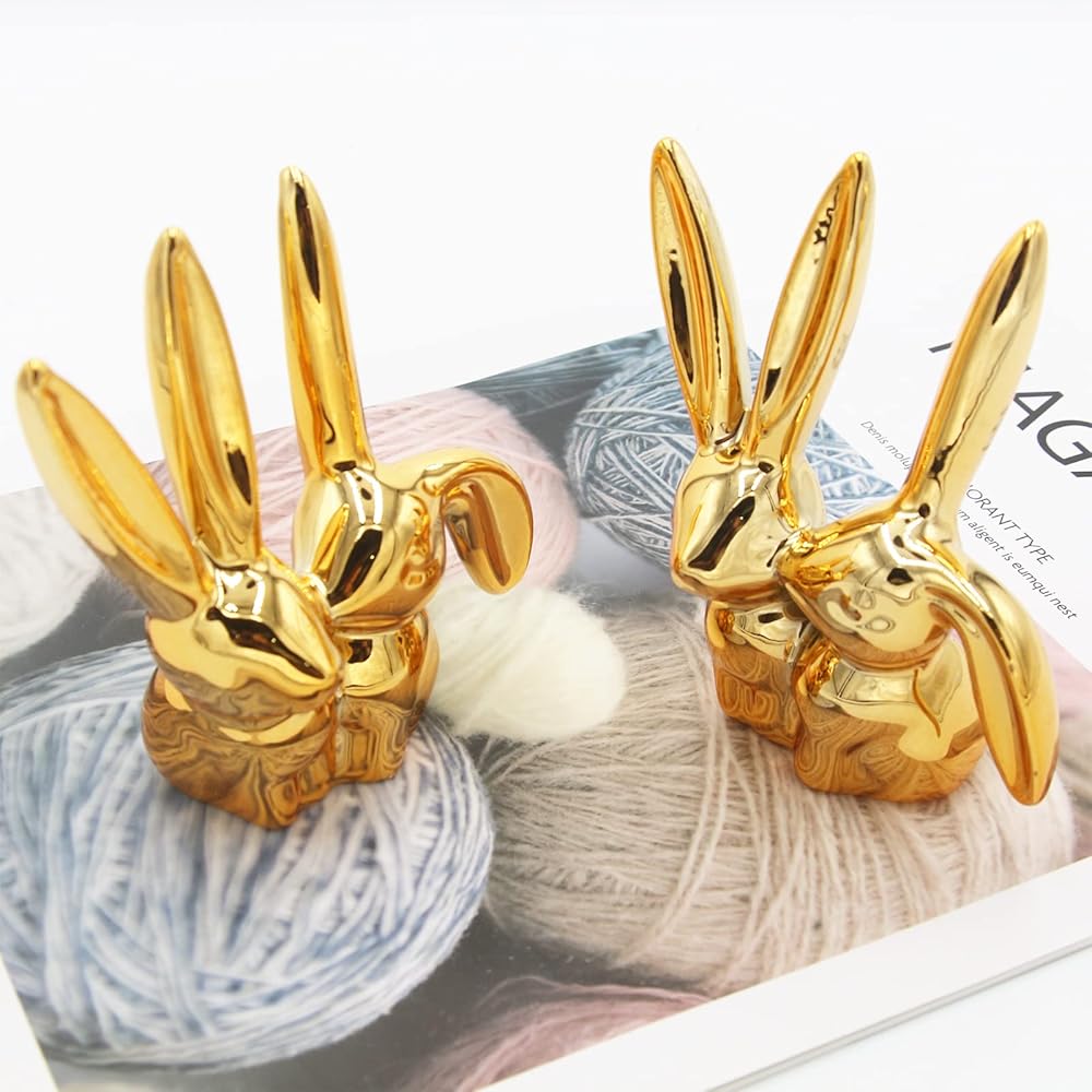 هانانونا قطعتان من التماثيل الخزفية على شكل ارنب من السيراميك، حامل خواتم ارنب ارنب سيراميك ذهبي، منحوتات وتماثيل لديكور المنزل في عيد الفصح، هدايا فنية يدوية الصنع (زوج ارنب ذهبي)