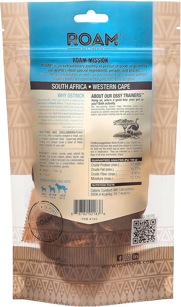 Roam Pet Treats Ossy Trainers لجميع أحجام الكلاب - مكافآت تدريب بحجم قضمة لحم النعام للكلاب