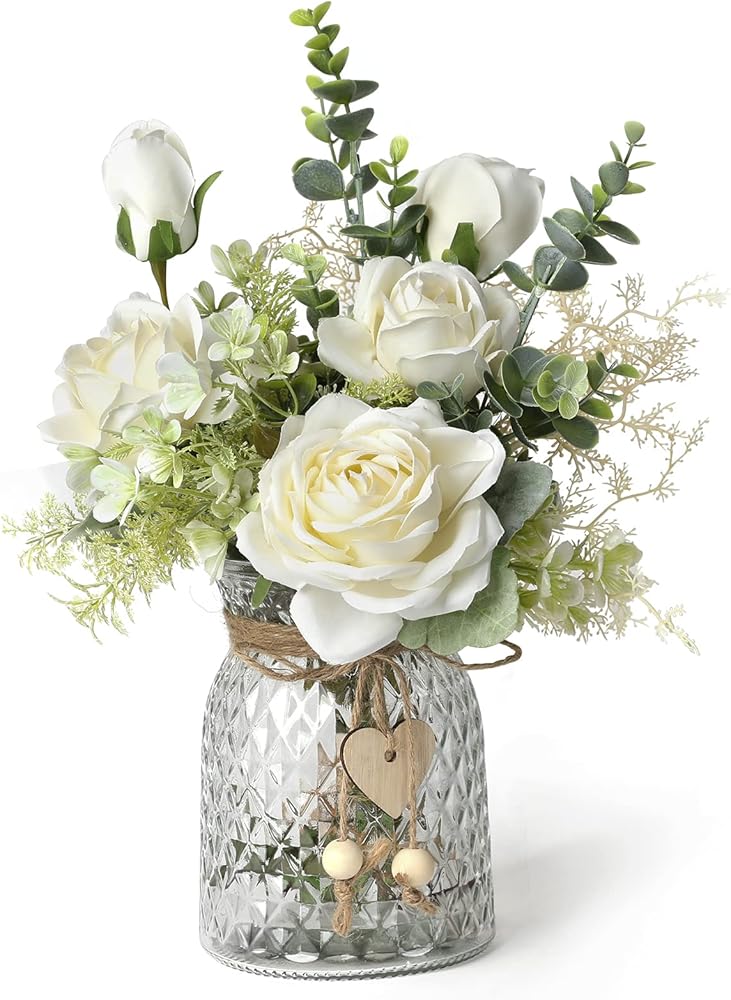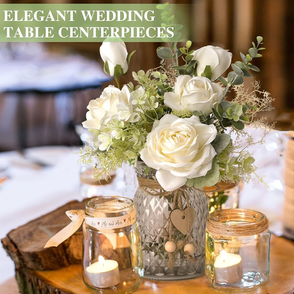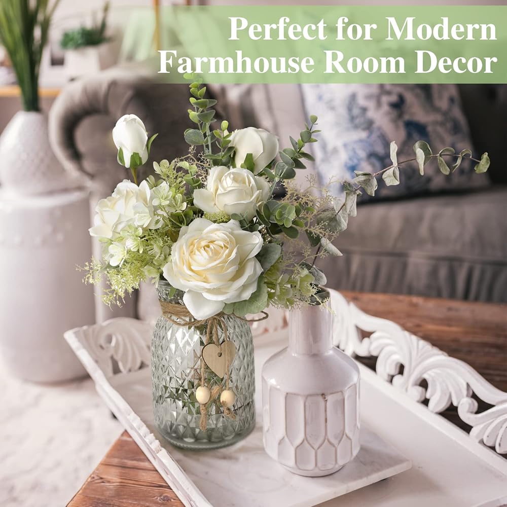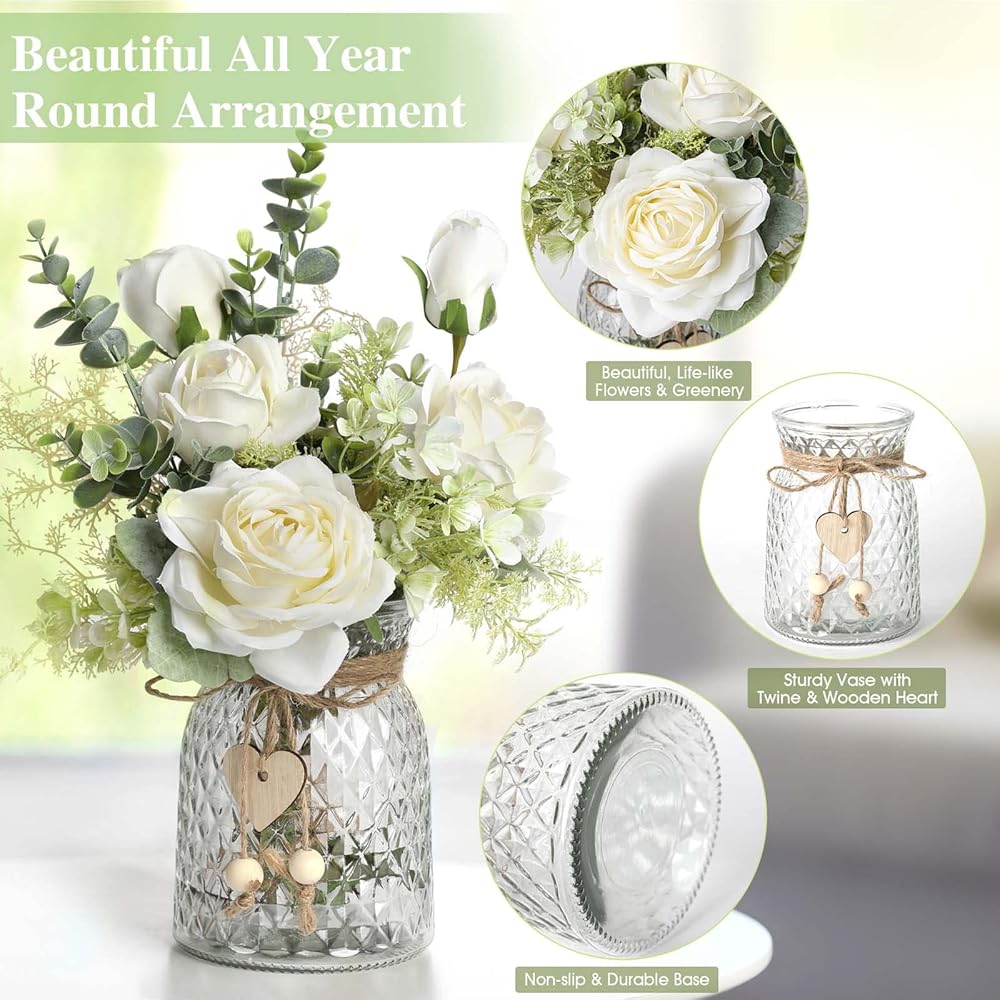 【زهور صناعية في مزهرية】تتضمن الزهور الاصطناعية البيضاء للزينة باقة جميلة ومزهرية زجاجية شفافة ولكنها متينة. تحتوي كل باقة على 7 سيقان تحتوي على سيقان زهور (5 رؤوس زهور إجمالاً) و5 نباتات خضراء أخرى. رقبة المزهرية الزجاجية مربوطة بخيوط وزخارف خشبية، والجسم له نمط نسيج شبكي، والجزء السفلي من المزهرية غير قابل للانزلاق. يمكنك استخدام هذه الباقة من الزهور المزيفة مع المزهرية لإضفاء البهجة على منزلك طوال العام.