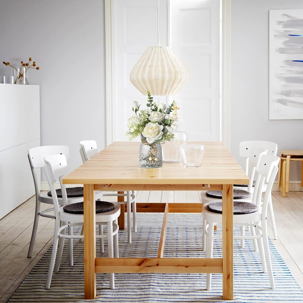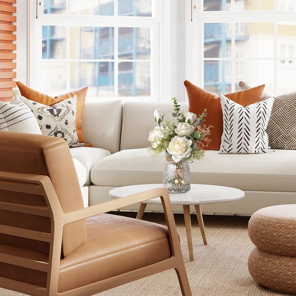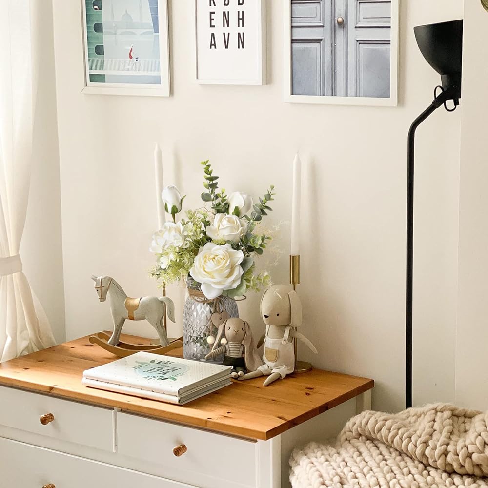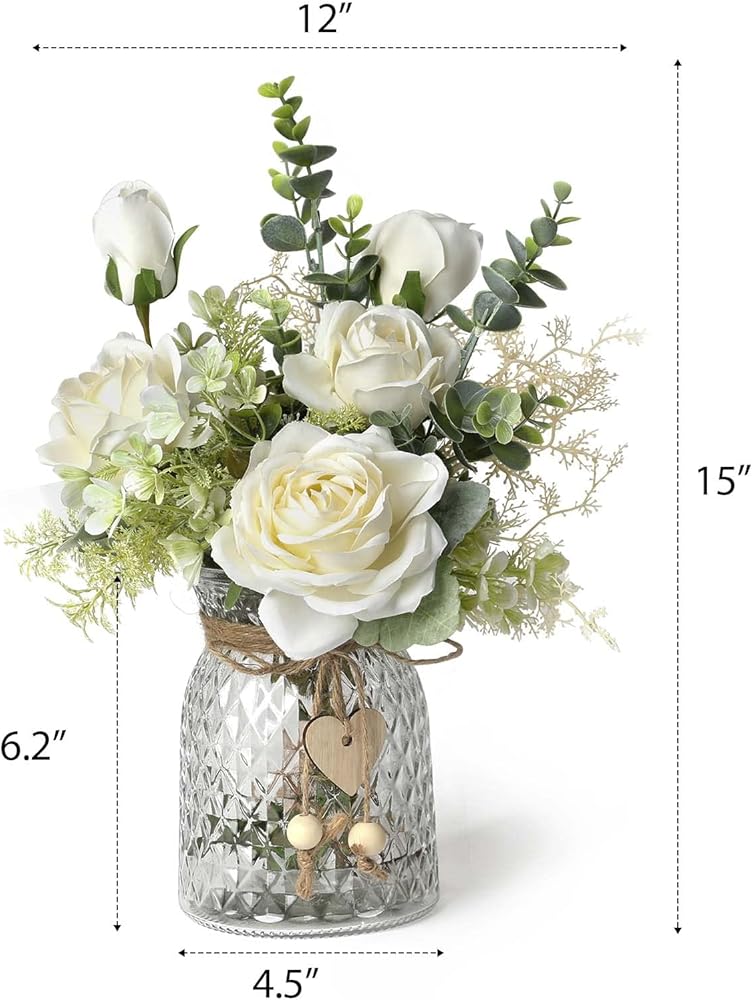【مظهر واقعي وخالي من الصيانة】الزهور الصناعية في المزهرية مصنوعة من قماش حريري فاخر واللون الأبيض ناعم ومشرق، قريب جدًا من زهور الورد الحقيقية. الفروع مصنوعة من البلاستيك المتين وتحتوي على أسلاك حديدية مرنة يمكن ثنيها أو قصها لتلبية احتياجاتك من الطول. تضمن المواد طويلة الأمد أن هذه الزهور المزيفة للزينة لا تحتاج أبدًا إلى الري أو الشمس وتبدو دائمًا في أفضل حالاتها.