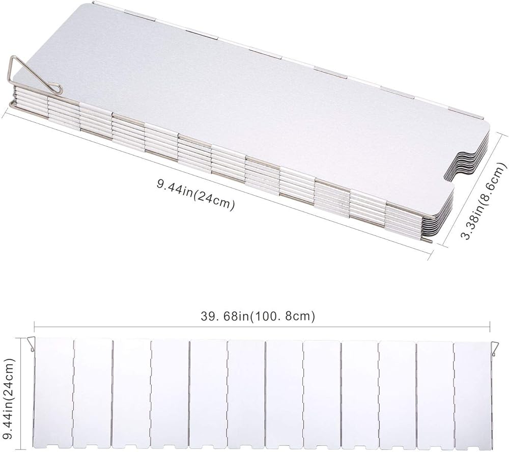 • 【Large Dimension】Folded size: 3.38x9.44in/8.6x24cm. Unfolded size: 33.07x9.44in/84x24cm. The camp stove windscreen is long and high enough to add protection to the flame in your gas backpacking stove and wood burning stove.