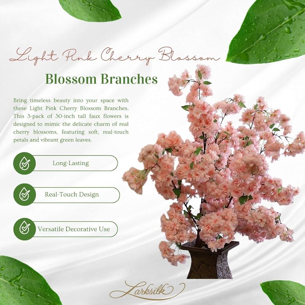 لاركسيلك فروع ازهار الكرز بلون زهري فاتح، ثلاثة ازهار الكرز مقاس 30 انش، الوان بينك فاتح واخضر، اوراق خضراء نابضة بالحياة، ديكور للمنزل والعمل، زهرة وطنية يابانية