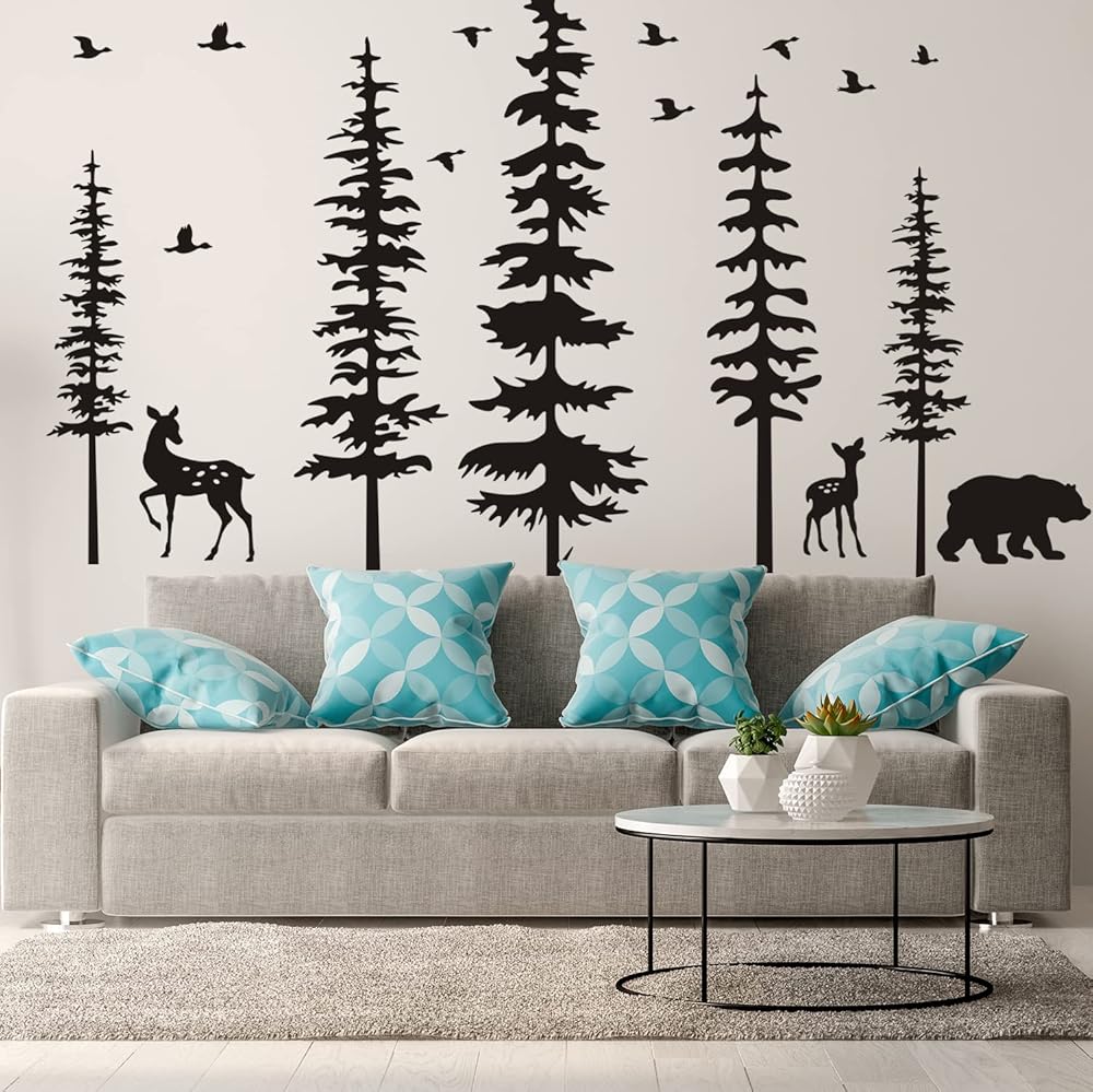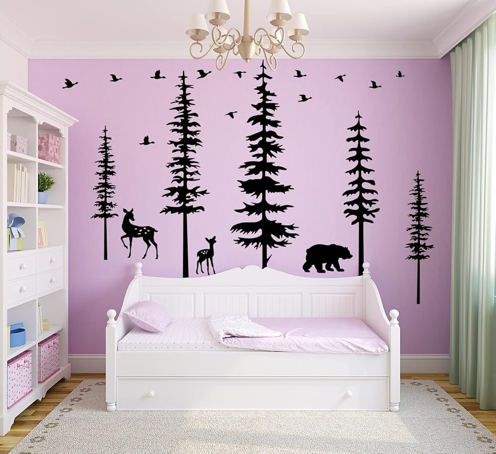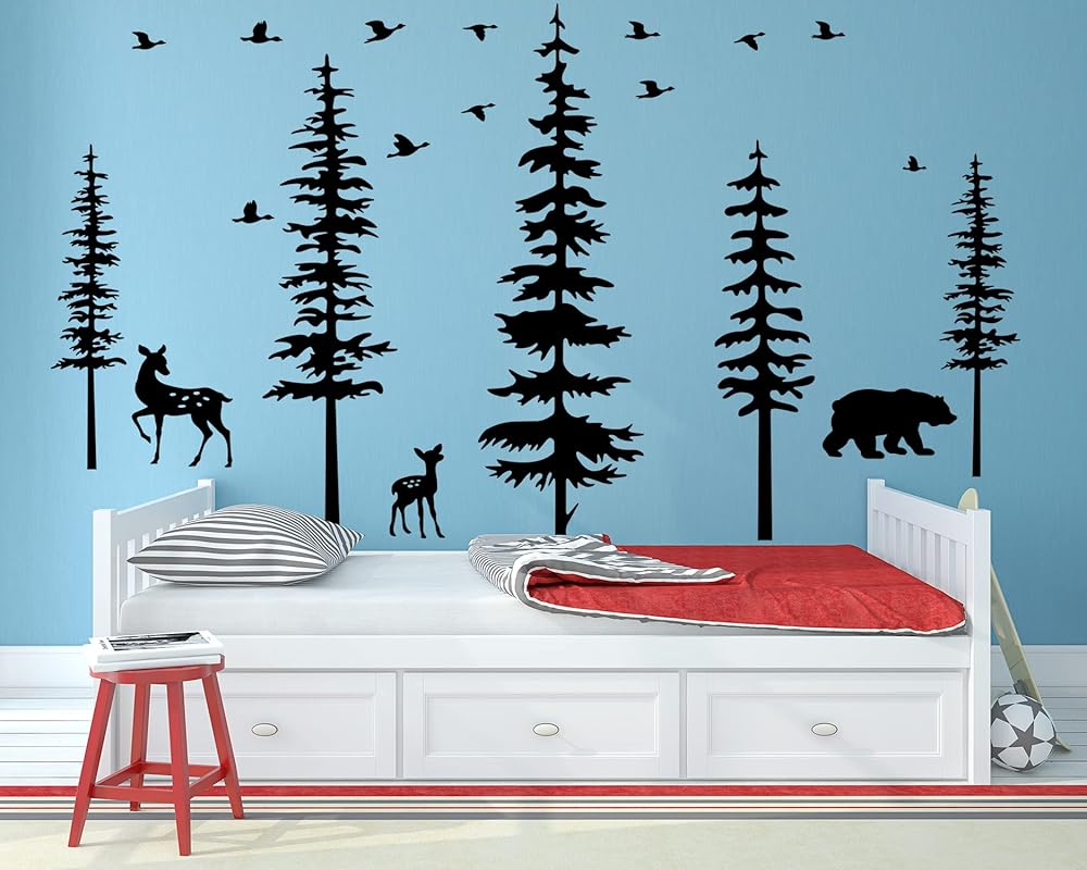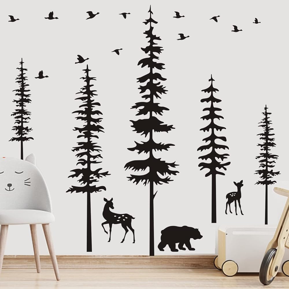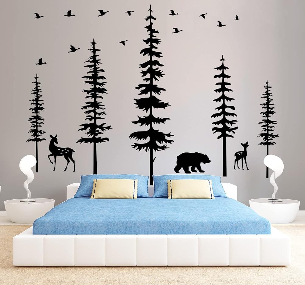 • Quantity and size: the package contains 5 trees and with Deer,Wild Goose ,Birds,Bear.The Largest Tree is 205cm H , Suggest using wall width 250-300cm to stick it . To make the decal fit you space 100% you should measure your space forest wall decals, You can paste it according to your favorite forest scene.
