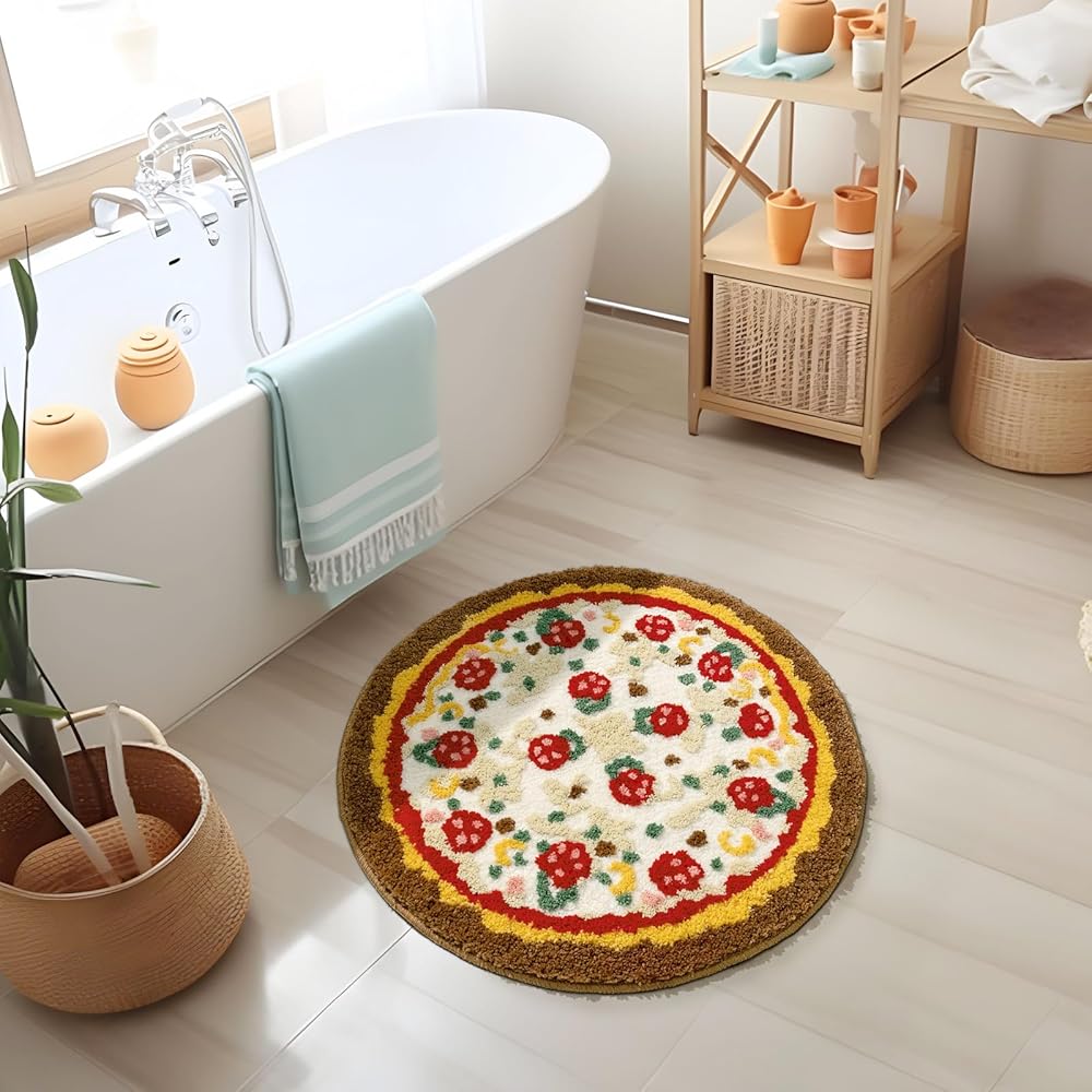 رياضيات حمام مضحكة: تم تصميم سجادة الحمام اللطيفة هذه على شكل بيتزا جميلة بجبنة الفراولة، والتي تبدو لذيذة. ستفاجئك عندما تحصل عليها، وسيستمتع الأطفال بشكل خاص بهذه السجادة الأرضية. تضيف حصيرة حمام البيتزا ديكورات لطيفة ومضحكة لمنزلك من خلال اللون الغني. مقاس سجادة الحمام 26*26 بوصة.