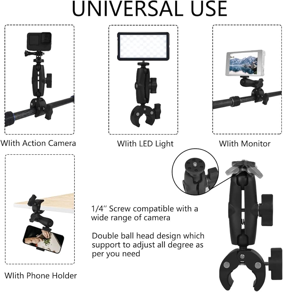 الاستخدام على نطاق واسع: رأس الكرة ذات مسامير 1/4 بوصة في الأعلى، هذا المنتج متوافق مع مجموعة واسعة من الكاميرا مثل سوني نيكون نيكون كوداك باناسونيك جو برو هيرو معظم أنواع كاميرا الحركة الرقمية دي اس ال ار وملحقاتها أو أدواتها، مثل الشاشة، وضوء الفيديو LED، والميكروفون، والإضاءة السريعة، وأكثر من ذلك. يسمح بمزيد من الإمكانيات بتركيب المزيد من الأجهزة.