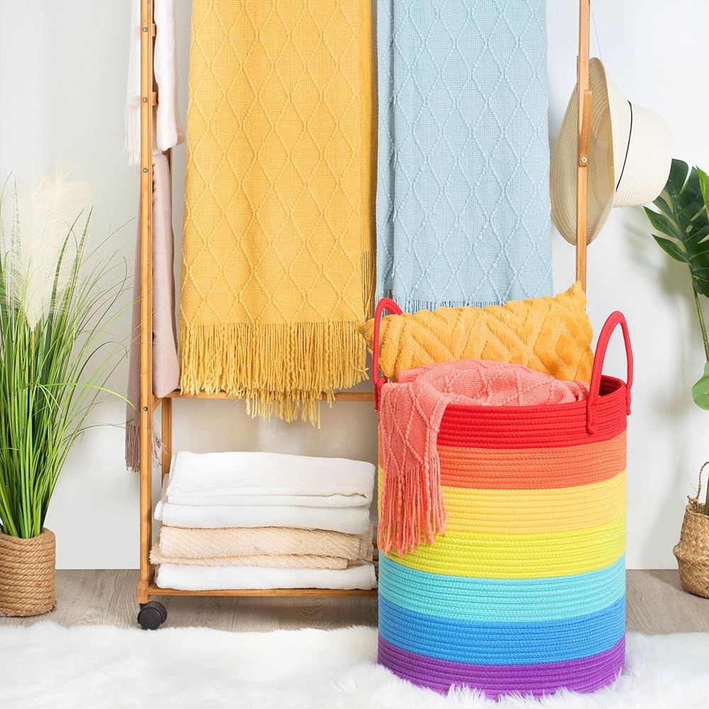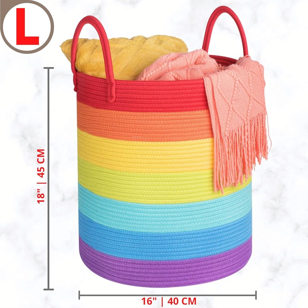 سلال تخزين كبيرة الحجم من الحبال القطنية مقاس 18 انش × 16 انش - كبيرة بما يكفي لتخزين الأشياء الضخمة مثل البطانيات الإضافية والألحفة ووسائد الزينة والوسائد والحيوانات المحشوة والملابس الشتوية والغسيل والمزيد. توفر مساحة كبيرة للأشياء المتنوعة الأصغر أيضًا، مثل الكتب والمجلات والألعاب للحفاظ على مساحة معيشتك أنيقة ومرتبة!