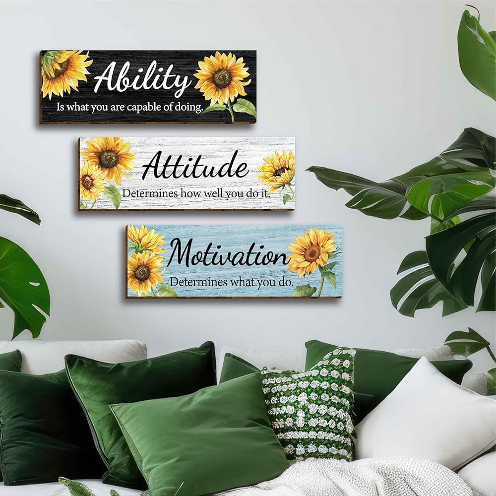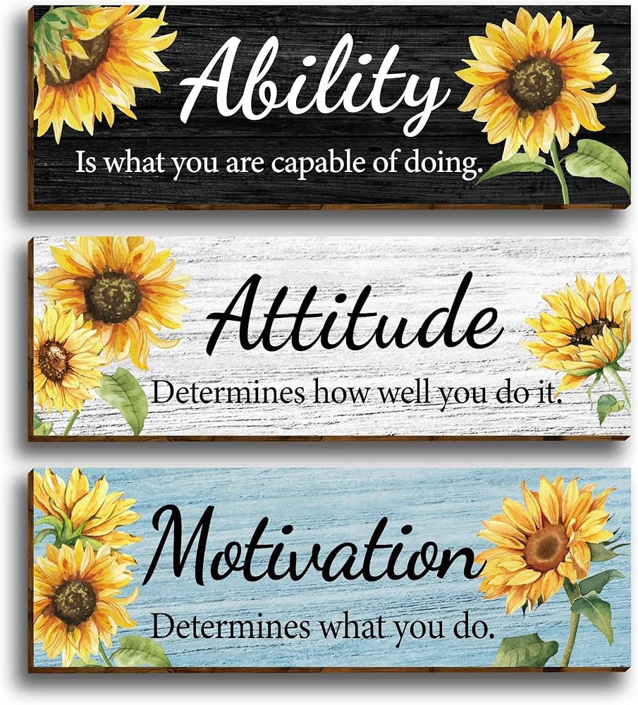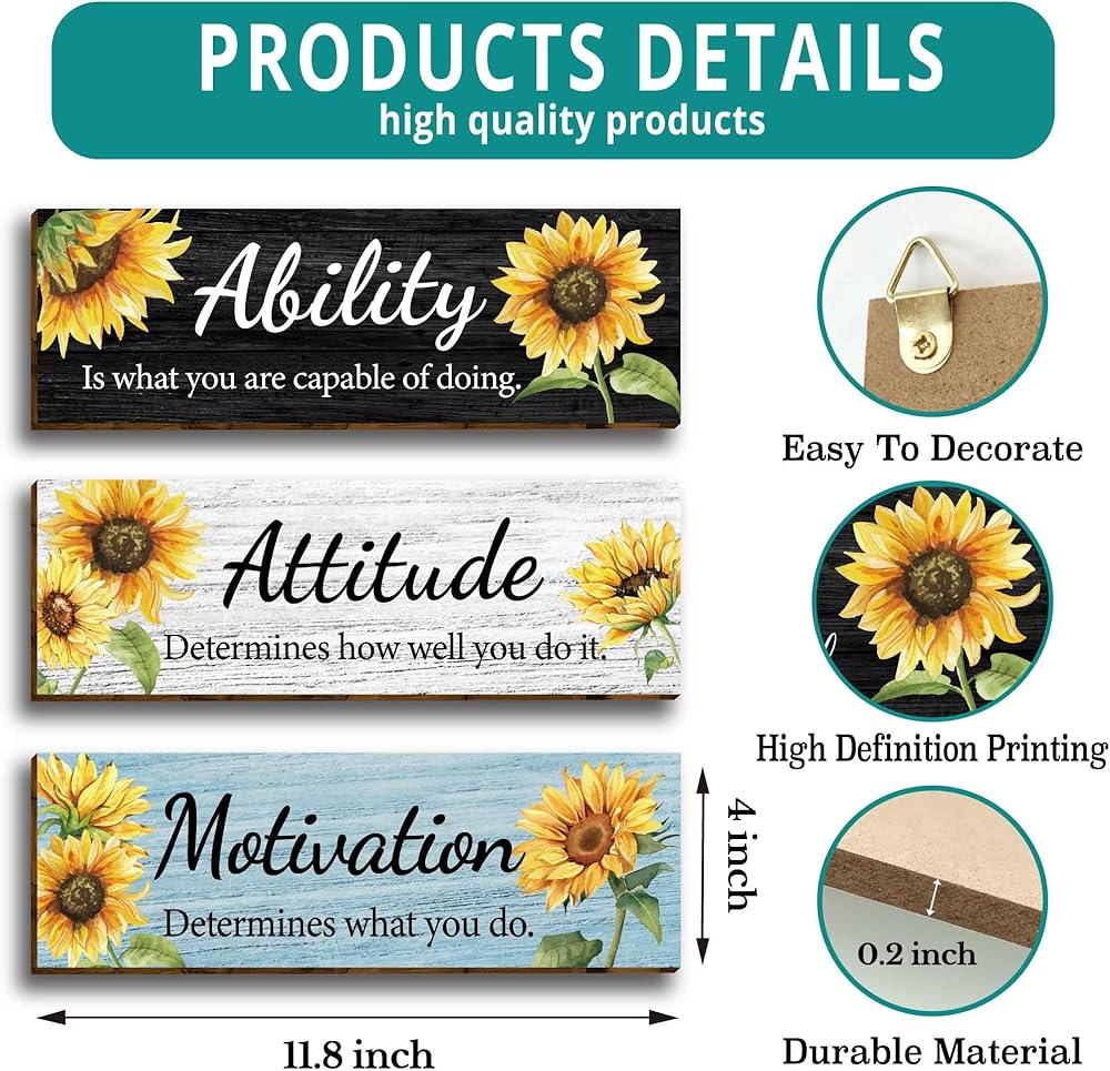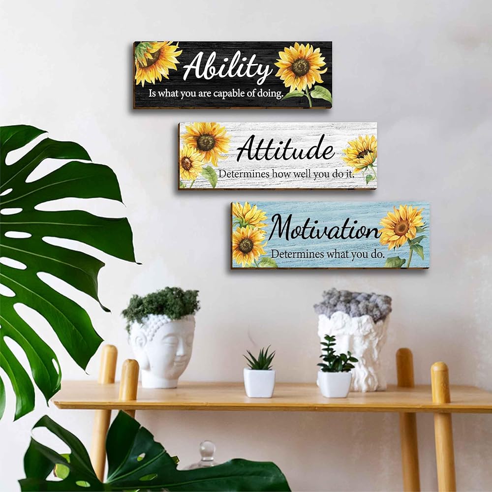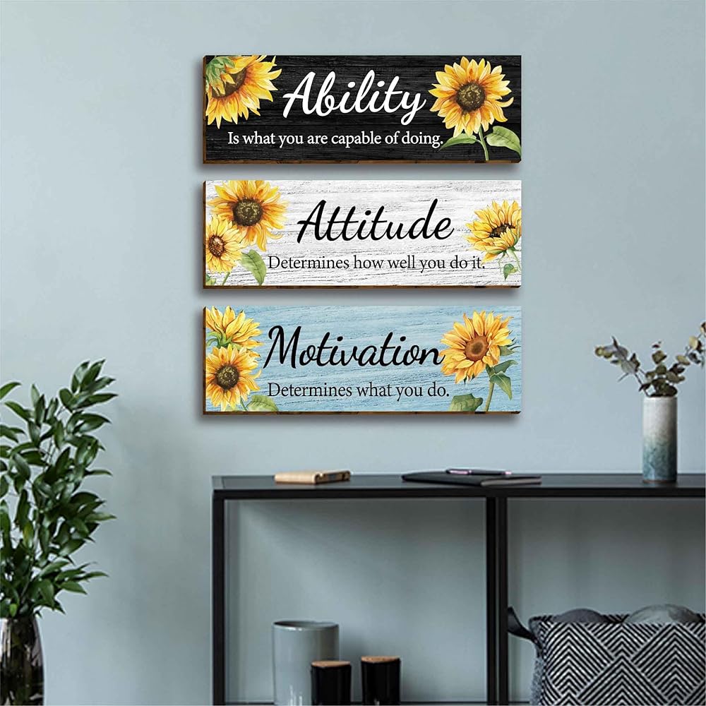 3 قطع عباد الشمس الحديثة الأزهار مكتب ديكور الحائط الخشبي، مقولة ملهمة مع اقتباسات تحفيزية للقدرة على الموقف، علامة خشبية معلقة لوحات جدارية تحفيزية للنساء والبنات في سن المراهقة غرفة المعيشة