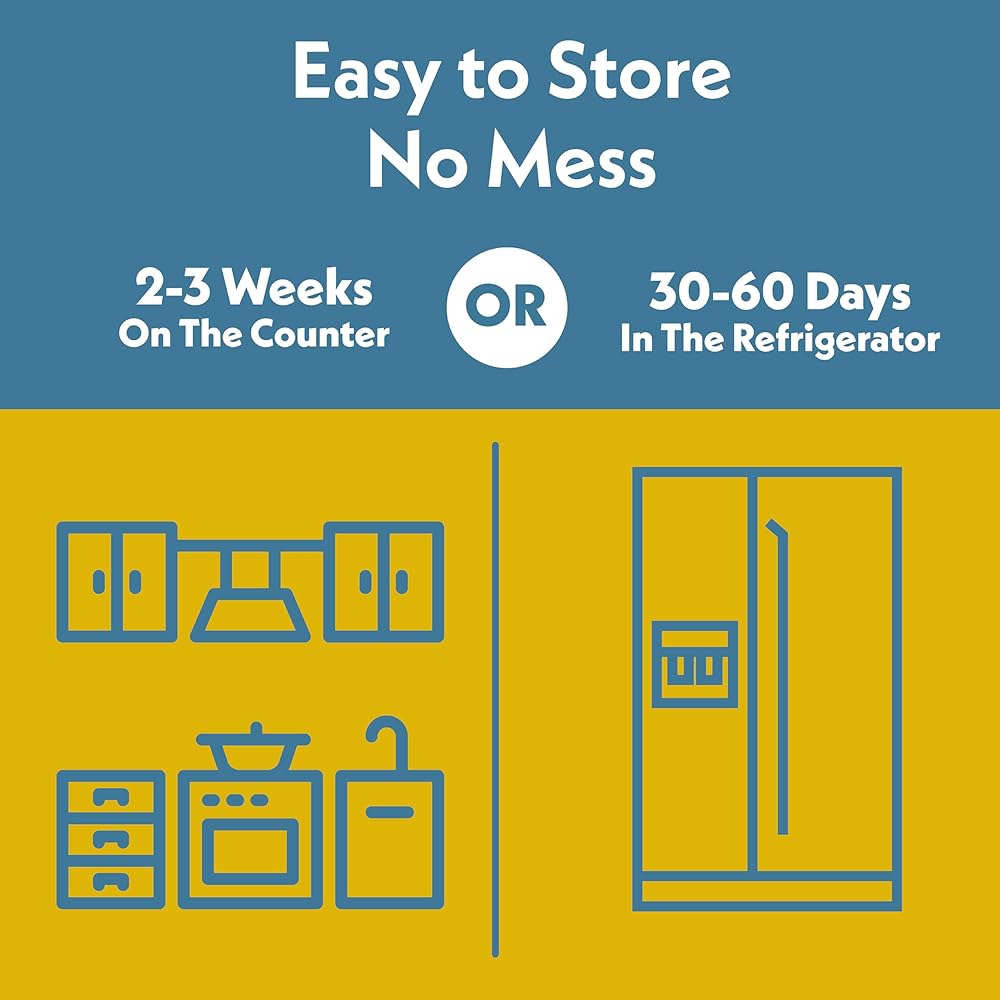 سهلة الاستخدام - تعتبر أداة الطعام هذه رائعة لجميع السلالات والأحجام، ويمكن تقديمها جافة عن طريق رش ملعقتين كبيرتين على طعام الحيوانات الأليفة العادي أو تقديمها مبللة عن طريق إعادة الترطيب بأجزاء متساوية من الماء. بمجرد فتحه، يمكن تخزينه بدون تبريد لمدة أسبوعين.