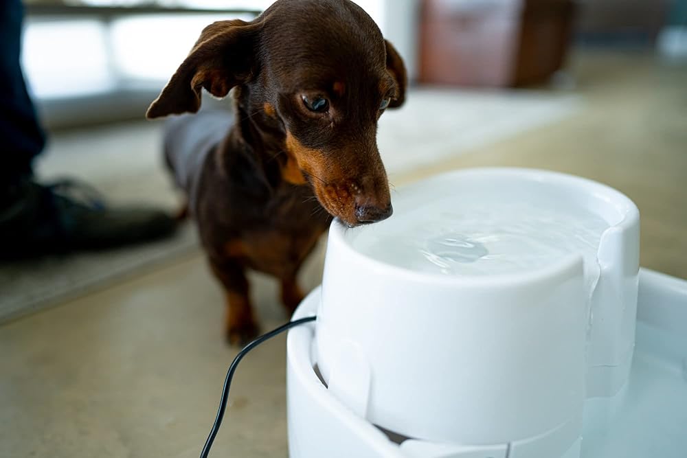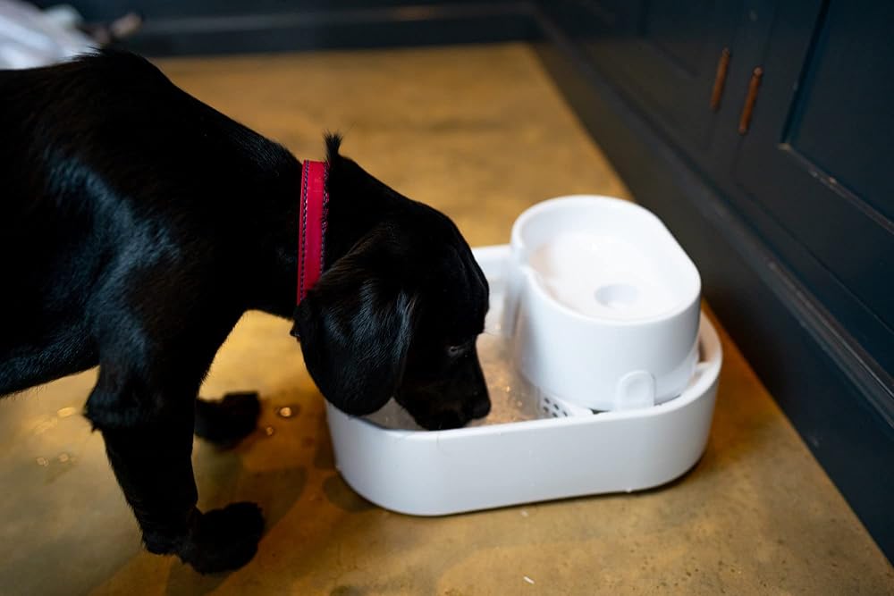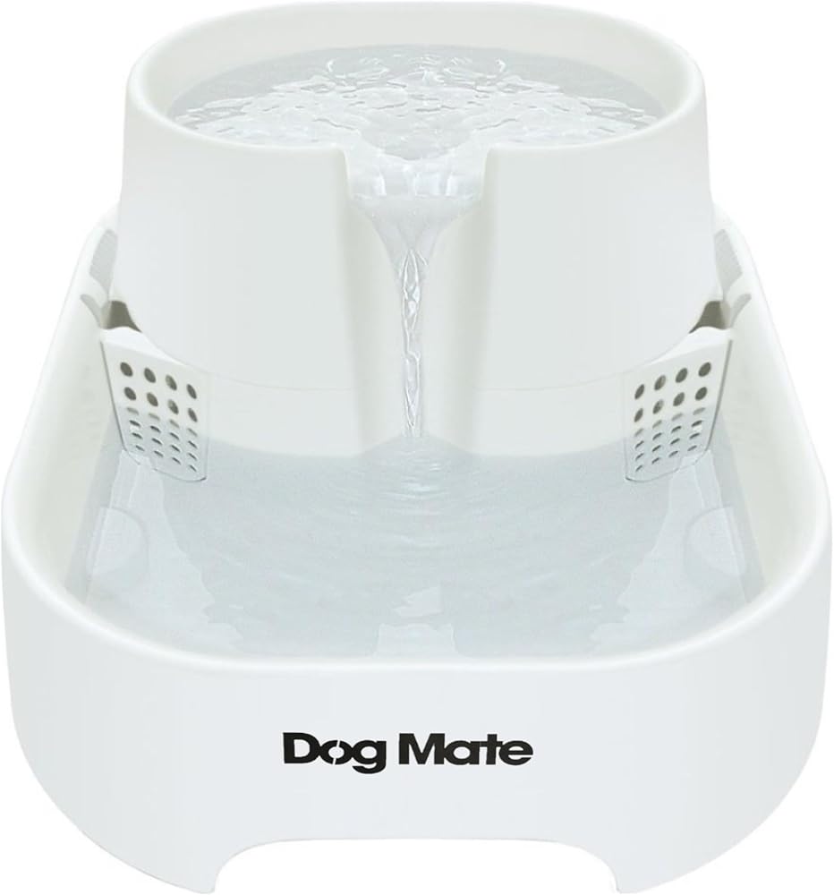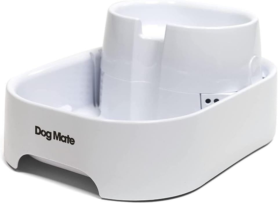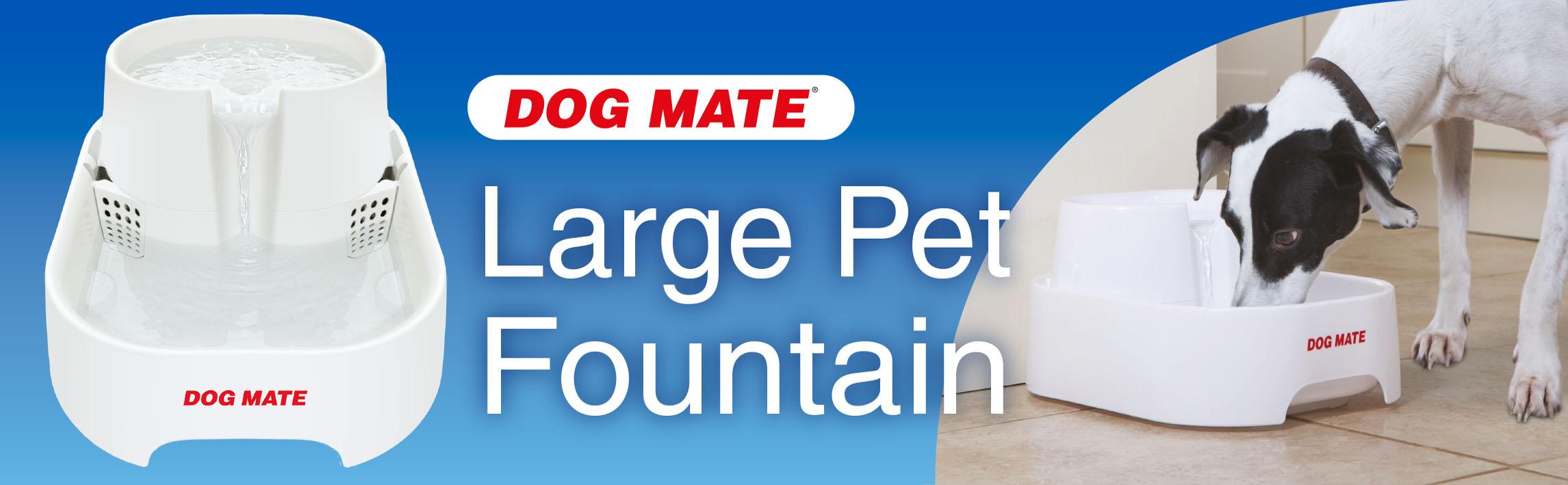 Vets tell us that it is important for your pet's health and vitality to keep them well hydrated, and the Dog Mate Large Pet Fountain has been designed to encourage pets to drink. Our carefully developed, unique design is exceptionally quiet in operation and maximises the appeal of drinking with multi-height drinking levels. The replaceable polymer-activated carbon filter cartridge (one included) keeps the water clear, fresh and free from odours. Your pet will love the clean, fresh flowing water this fountain provides. The generous 200 fluid ounce water capacity makes this pet fountain ideal for dogs of all sizes, also suitable for cats and multi-pet households. Setting up could not be easier as the whole unit is self-contained, so no plumbing is required. Just keep the bottom bowl regularly topped-up to the “maximum” level with cold tap water. The super-quiet pump is powered by a low voltage power supply for safety and comes with a 10 feet length power cable for ease of placement. And with a low power consumption of just 2 Watts, you won't even notice it on your electricity bill. Maintenance is simple too as the bowls are dishwasher safe and replacement filter cartridges slide easily into position. It is recommend that cartridges are replaced monthly, or sooner if required. Only use Cat Mate/Dog Mate branded filter cartridges to prolong the life of your pump. The pump should also be disassembled (no tools required) and cleaned every few weeks (or more frequently in hard water areas) to prevent limescale build-up. Easy to follow instructions on how to do this are included. The Dog Mate Large Pet Fountain has a three year manufacturer's guarantee and the replaceable pump has a one year guarantee.