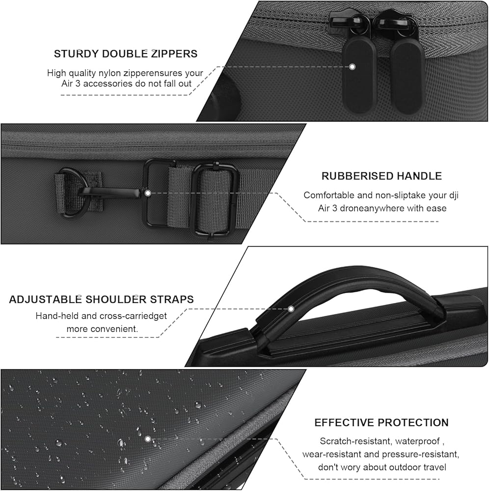 • 【حماية كاملة】حقيبة حمل لجهاز دي جيه اي اير 3، مصنوعة من مادة البولي يوريثين الجلدية عالية الجودة، يمكنها منع تسرب الماء بشكل فعال، وهي مضادة للانزلاق ومقاومة للخدش، حماية 360 درجة للطائرة بدون طيار وملحقاتها لتجنب أضرار الاصطدام