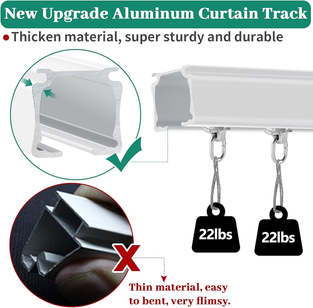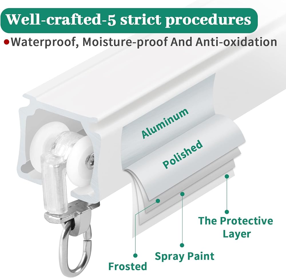 • ألومنيوم عالي الجودة: مسار ستارة السقف مصنوع من الألومنيوم عالي الجودة، شديد التحمل، هيكل صلب وقوي. ليس فقط مضاد للتآكل والصدأ، ولكن أيضًا يمكنه تحمل الوزن الثقيل دون أي مشكلة، مما يضمن المتانة وطول العمر. مسار ستارة من الألومنيوم شديد التحمل أقوى مرتين من مسار الستارة البلاستيكي المرن.