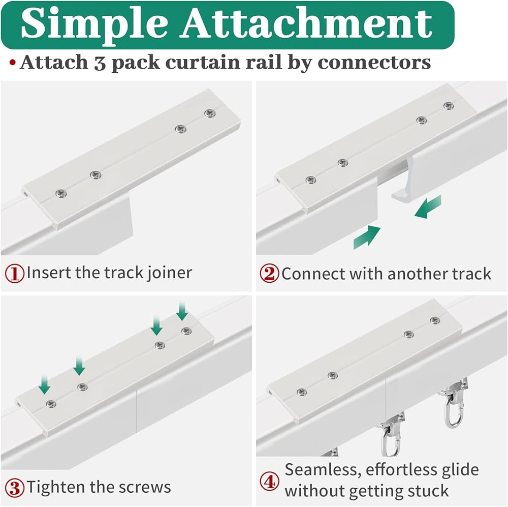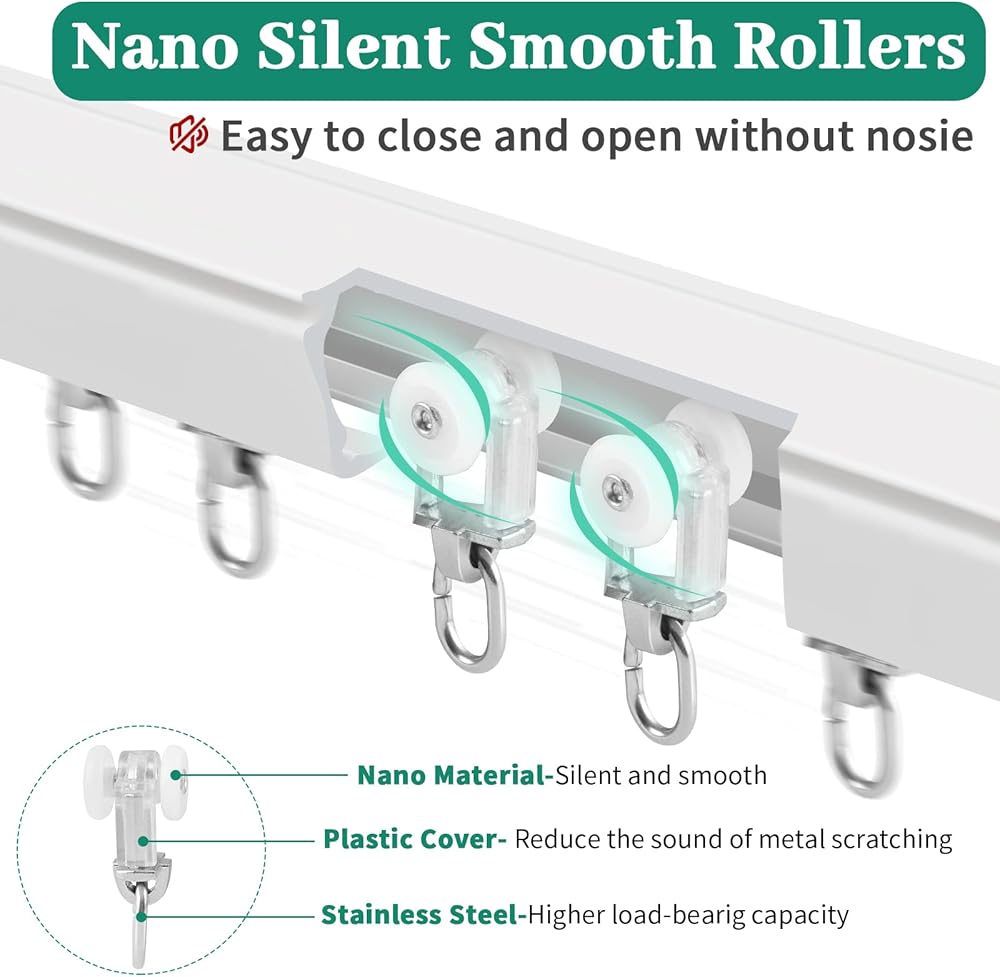 بكرات مطورة: يأتي مسار ستارة السقف المتدلي مع بكرات مسار ستارة مطورة، البكرات مصنوعة من مادة نانو، يمكن فتحها وإغلاقها بسهولة، تنزلق بسلاسة وبصمت - بدون شد أو تمزق. خطافات من الستانلس ستيل: خطافات مسار الستارة مصممة بتسنن مزدوج الجوانب، مثبتة بشكل أكثر ثباتًا دون القلق بشأن سقوط ستائر المسار.