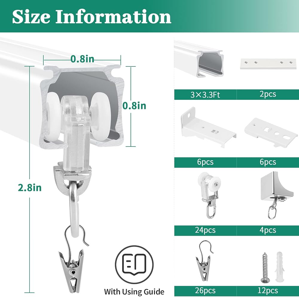 • تصميم للاستخدام المتنوع: يتميز نظام مسار الستارة بلمسة نهائية بيضاء لؤلؤية وأغطية طرفية أنيقة وقطعة زاوية نظيفة بدون أي حافة حادة. يتناسب مسار الستارة المنزلق بشكل جيد مع معظم أنماط ستائر السقف، ويمكن استخدامه لمسار ستارة المستشفى أو مسار ستارة ار في أو مقسم للغرفة أو الحمام أو غرفة النوم أو غرفة الملابس أو أي مساحات ضيقة.