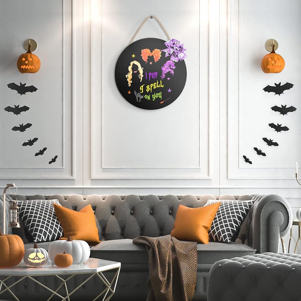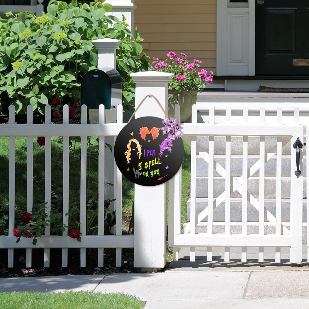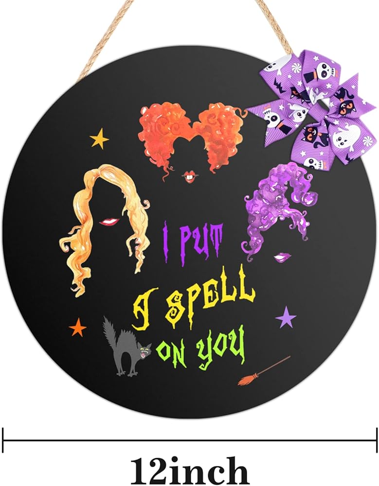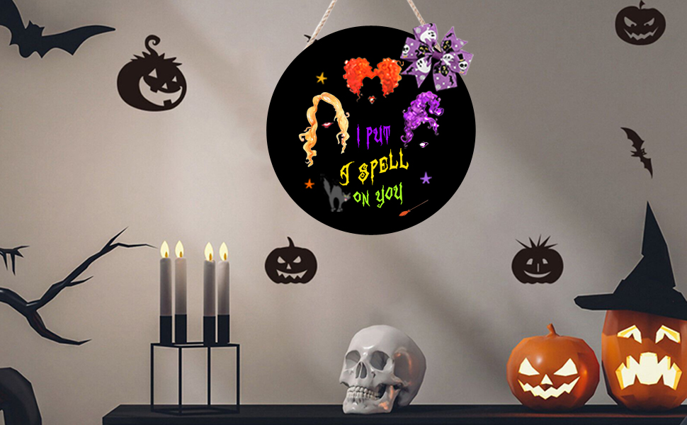 Unique Design: The theme of the hocus pocus decorations hanger is three witch sisters, the classic line "I put a spell on you" is very suitable for the Halloween horror and fun atmosphere.