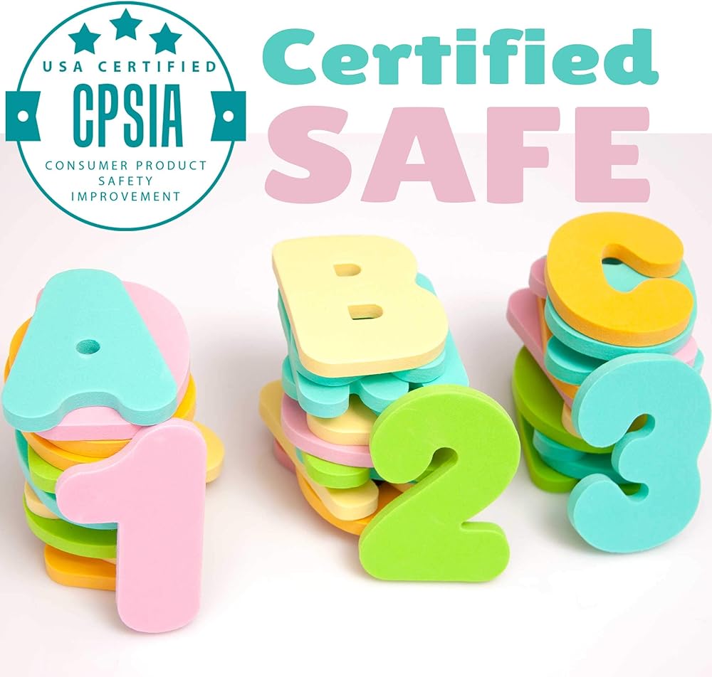 • 🔡 طريقة آمنة لجعل وقت الاستحمام ممتعًا - مصنوعة من رغوة طبية خالية من الفورماميد، والعناصر السطحية المستخدمة في حروف وأرقام حمام الطفل تقع ضمن المعايير المقبولة كما هي محددة حاليًا من قبل لجنة سلامة المنتجات الاستهلاكية (CPSC) والأمريكية. جمعية الاختبارات والمواد (ASTM) الدولية.