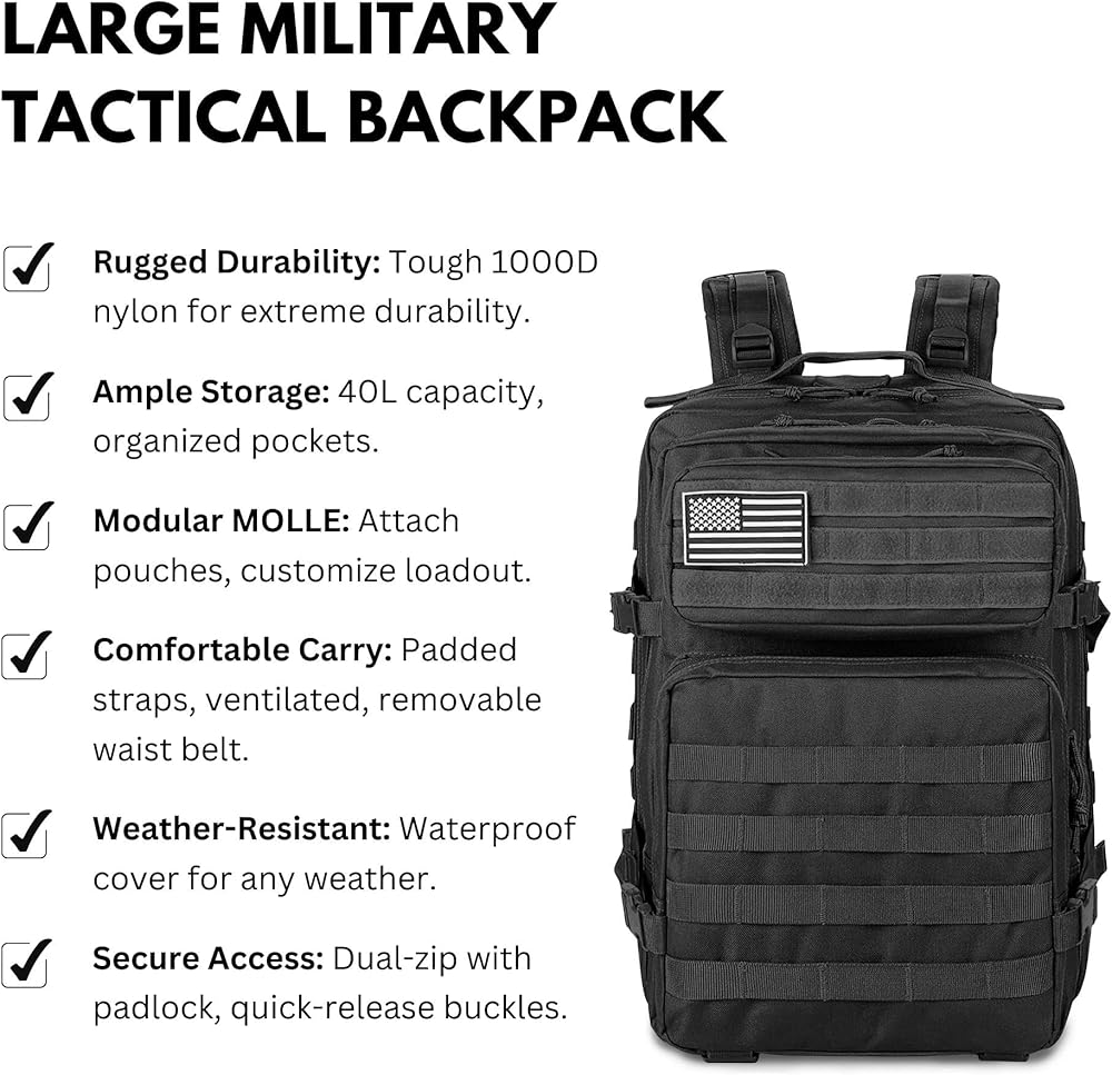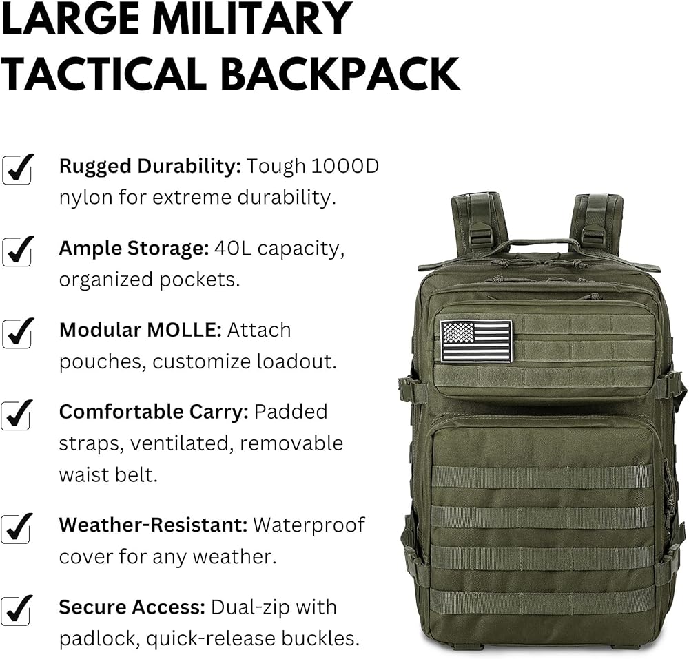 Rugged Durability: Constructed from high-quality, heavy-duty materials, this backpack is designed to withstand harsh conditions, making it ideal for military, outdoor, and adventure use. Crafted from heavy-duty 1000D polyester or sturdy nylon, ensuring exceptional durability and resilience against harsh conditions.