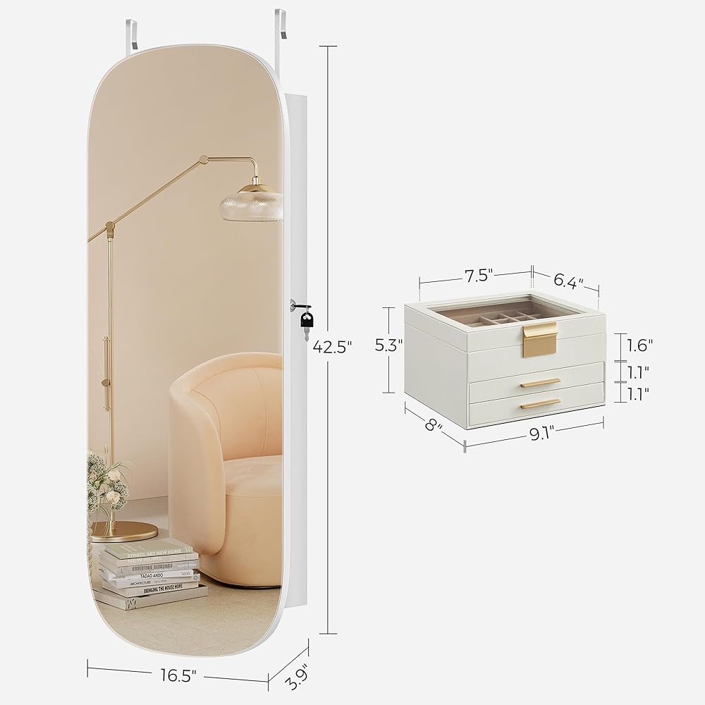 [تشمل الحزمة] صندوق مجوهرات بغطاء زجاجي شفاف، بالإضافة إلى خزانة مجوهرات LED مثبتة على الحائط أو الباب مع مرآة عريضة مستديرة. كلاهما مثالي لتنظيم وعرض مجموعة المجوهرات الثمينة الخاصة بك