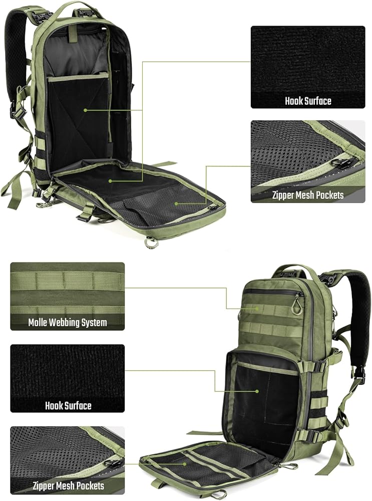 【حرفية بأعلى المعايير】تم تصنيع حقيبة الظهر الخاصة بنا بدقة من خلال عمليات القطع بالليزر الدقيقة والخياطة اليدوية لتلبية أعلى معايير الجودة. تعمل تعزيزات حزام Molle على تعزيز متانة الحقيبة ومتانتها. هذا الاهتمام بالتفاصيل لا يجعل حقيبة الظهر أكثر مرونة فحسب، بل يسلط الضوء أيضًا على الحرفية الاحترافية والمتقنة، مما يسمح لك بالشعور بالجودة العالية للمنتج أثناء الاستخدام.