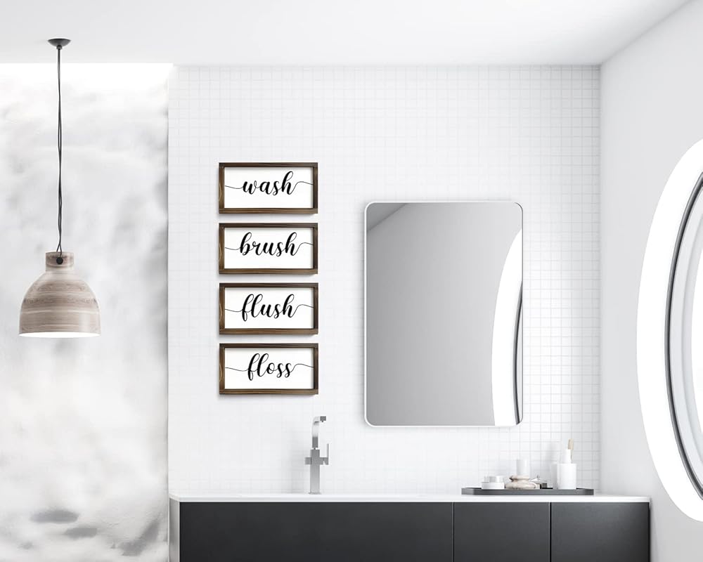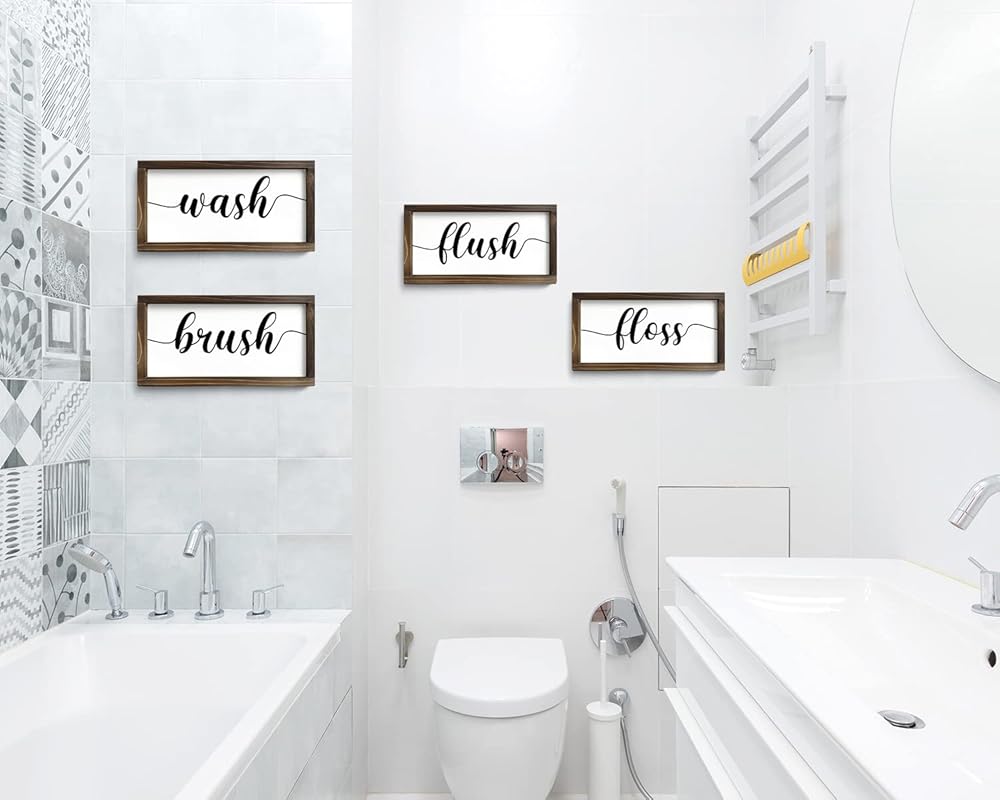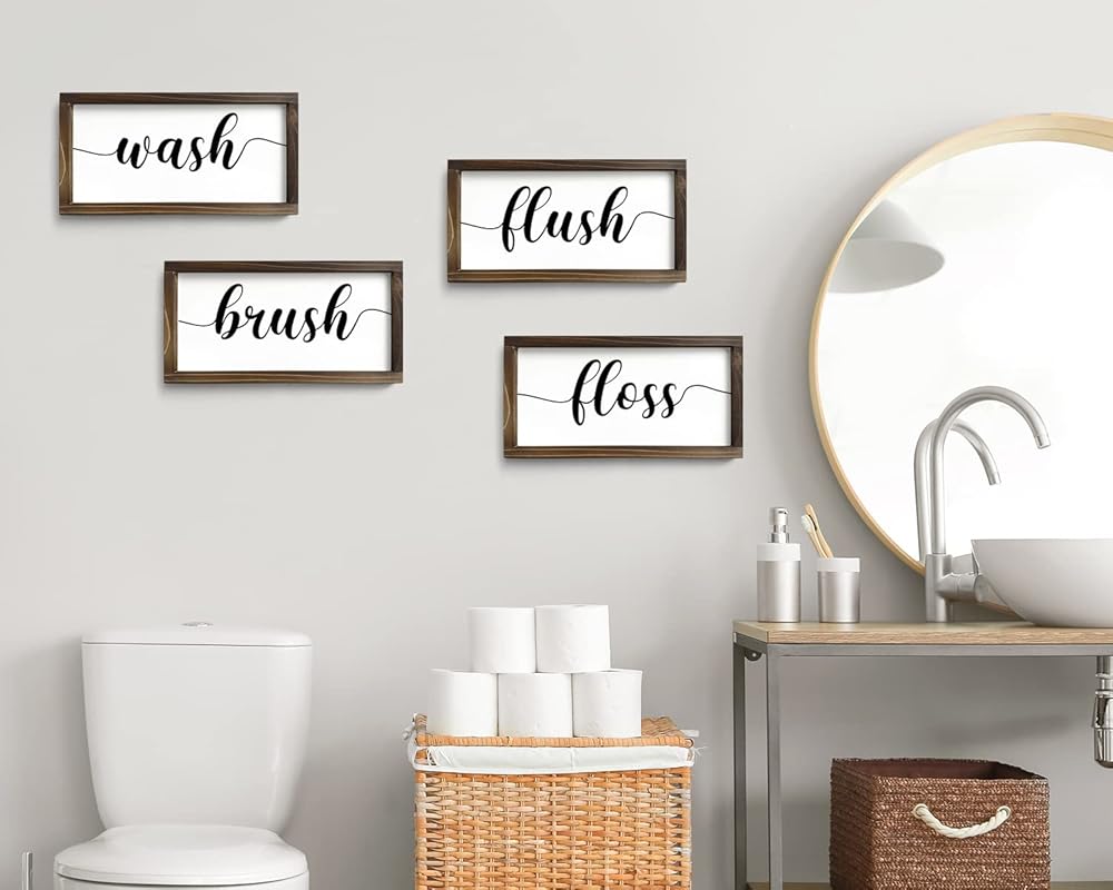 Set of 4 Farmhouse Bathroom Wall Decor Wash, Brush, Floss, Flush Sign Modern Rustic Style Home Decoration Solid Wood Framed Wall Decoration