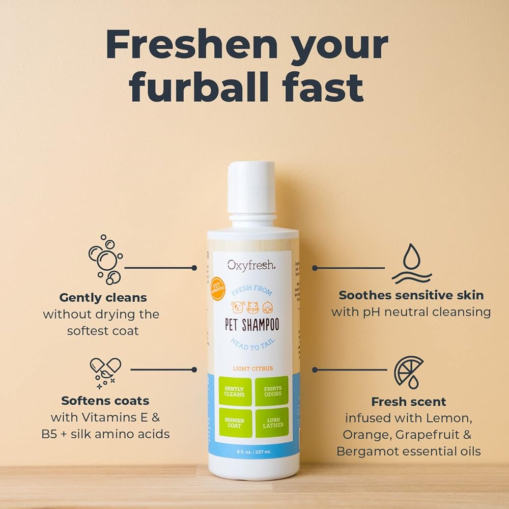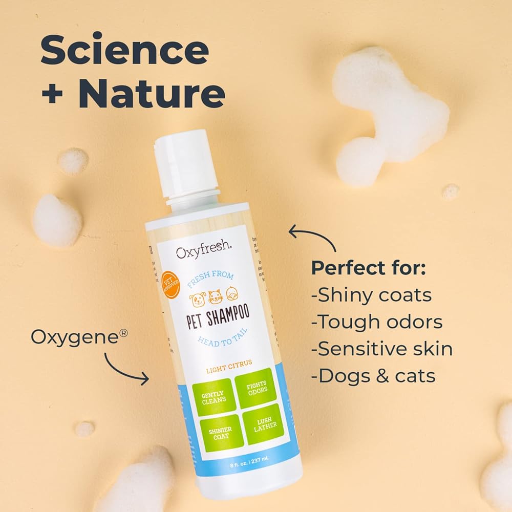 Our light citrus, pH balanced pet shampoo has only safe, gentle ingredients to give pets a shiny, fresh & beautiful coat. Our formula also naturally safeguards against fleas and ticks. Oxyfresh Pet Shampoo is definitely Best In Show. We designed our pH balanced formula to support and soothe pet's delicate skin as it is key to overall pet health. It is crucial to their natural defense against shedding, itching, dryness and odor.