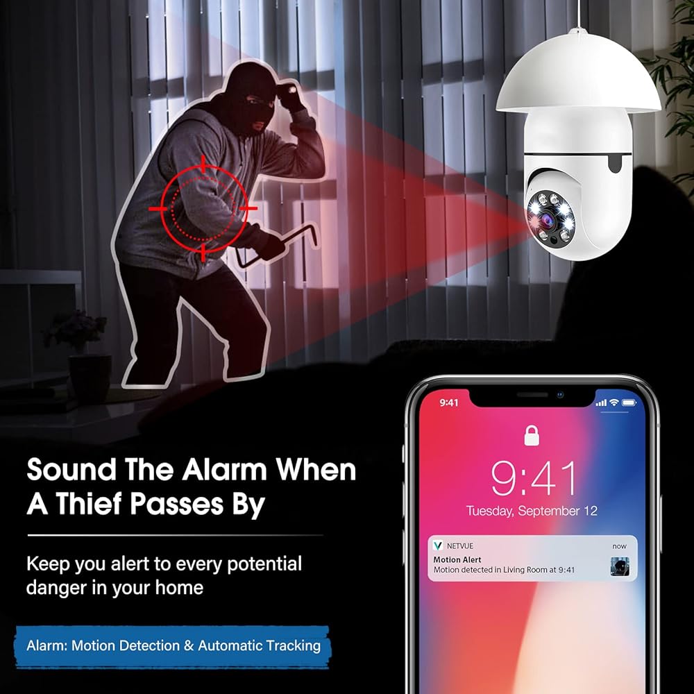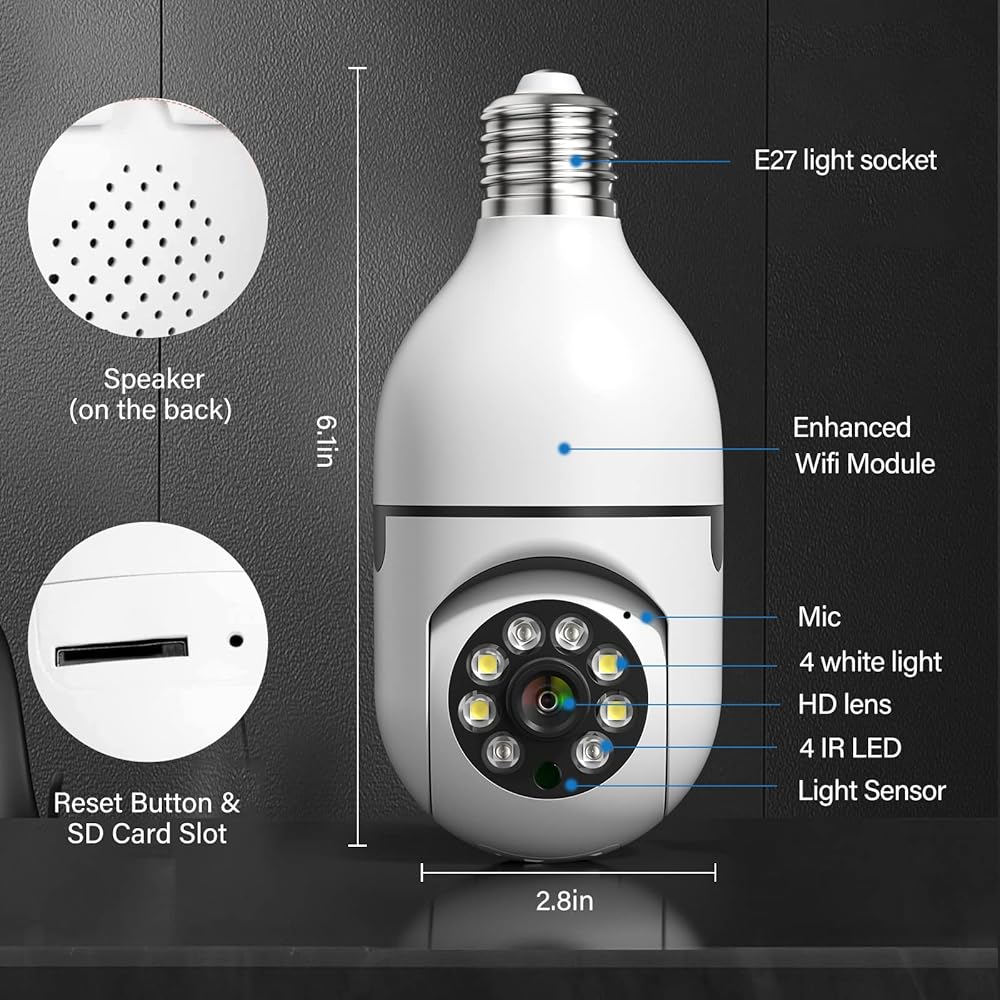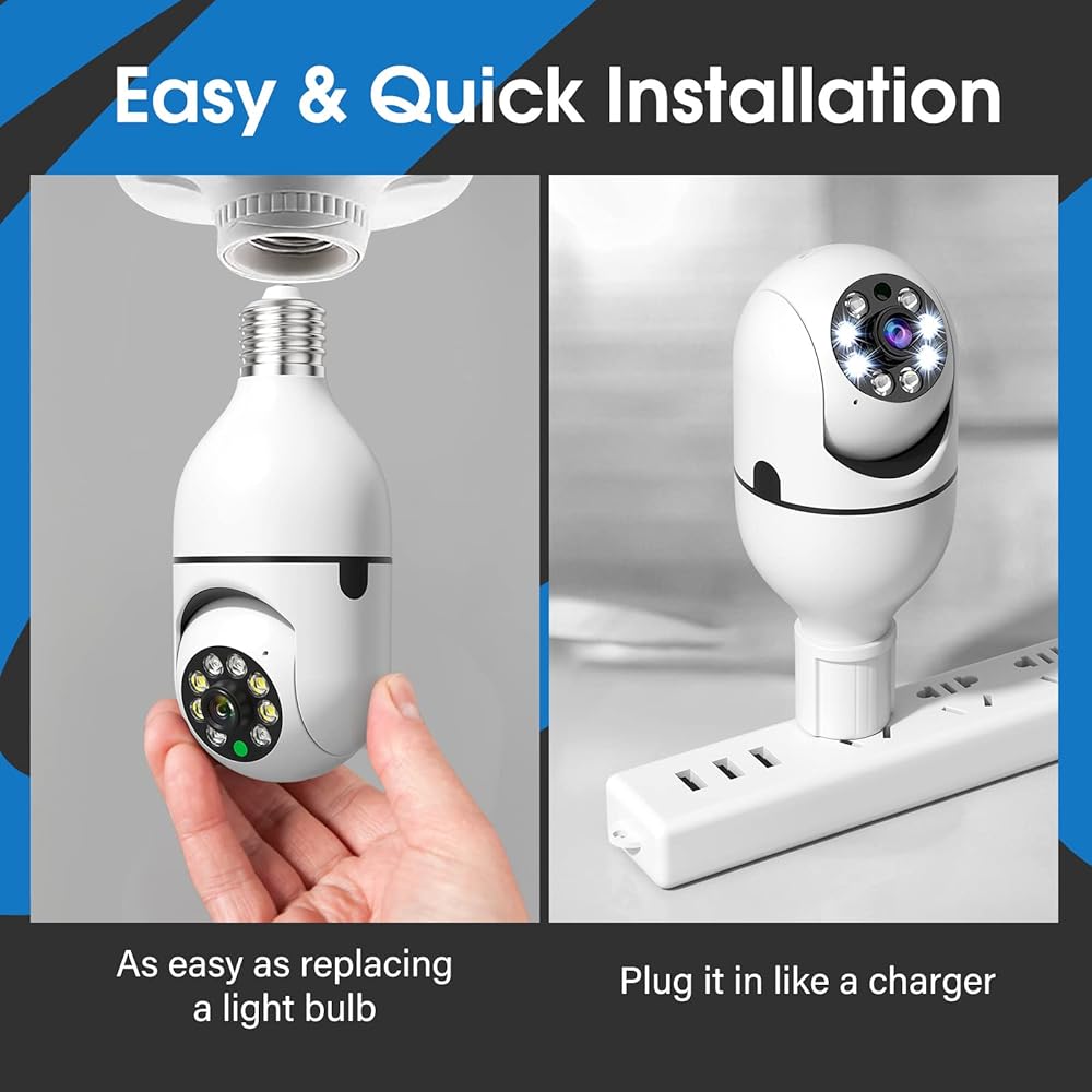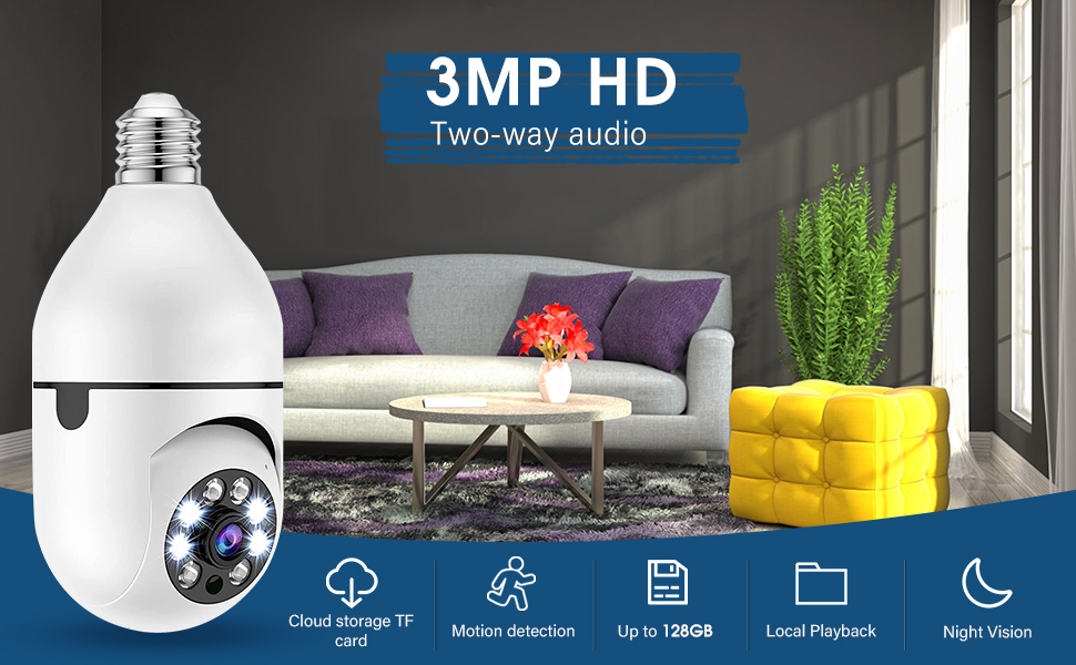 تركيب وإعداد سريع: تركيب كاميرا المصباح الكهربائي بسيط مثل استبدال المصباح الكهربائي، باستخدام قاعدة لمبة E27 العادية (110 فولت ~ 240 فولت)، لا مزيد من خطوات التثبيت الإضافية. قم بمسح رمز الاستجابة السريعة أو متجر التطبيقات لتنزيل تطبيق "ICSee". ثم قم بالاتصال بشبكة WiFi بسرعة 2.4 جيجا هرتز، ولا يتم دعم شبكة WiFi بسرعة 5 جيجا هرتز. دعم نظام الهاتف المحمول: IOS7 UP، Android 4.0 up.