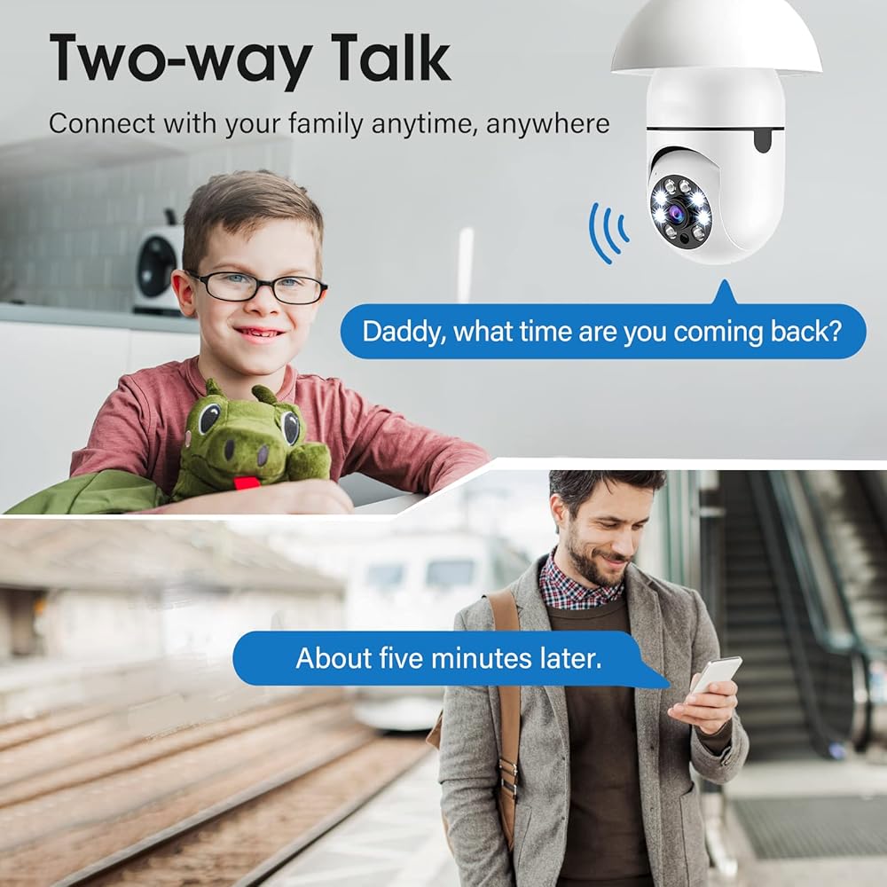 【اتصال ثنائي الاتجاه】 يحتوي جهاز كاميرا الأمان على مكبر صوت وميكروفون مدمجين، ويدعم التحدث الفوري بين التطبيق والكاميرا. بغض النظر عن مكان وجودك، يمكنك التحدث مع أطفالك أو حيواناتك الأليفة في أي وقت لتذكيرهم بالاهتمام بالسلامة. كاميراتنا اللمبة هي نظام المراقبة المثالي للمنازل والمكاتب ومراكز التسوق.