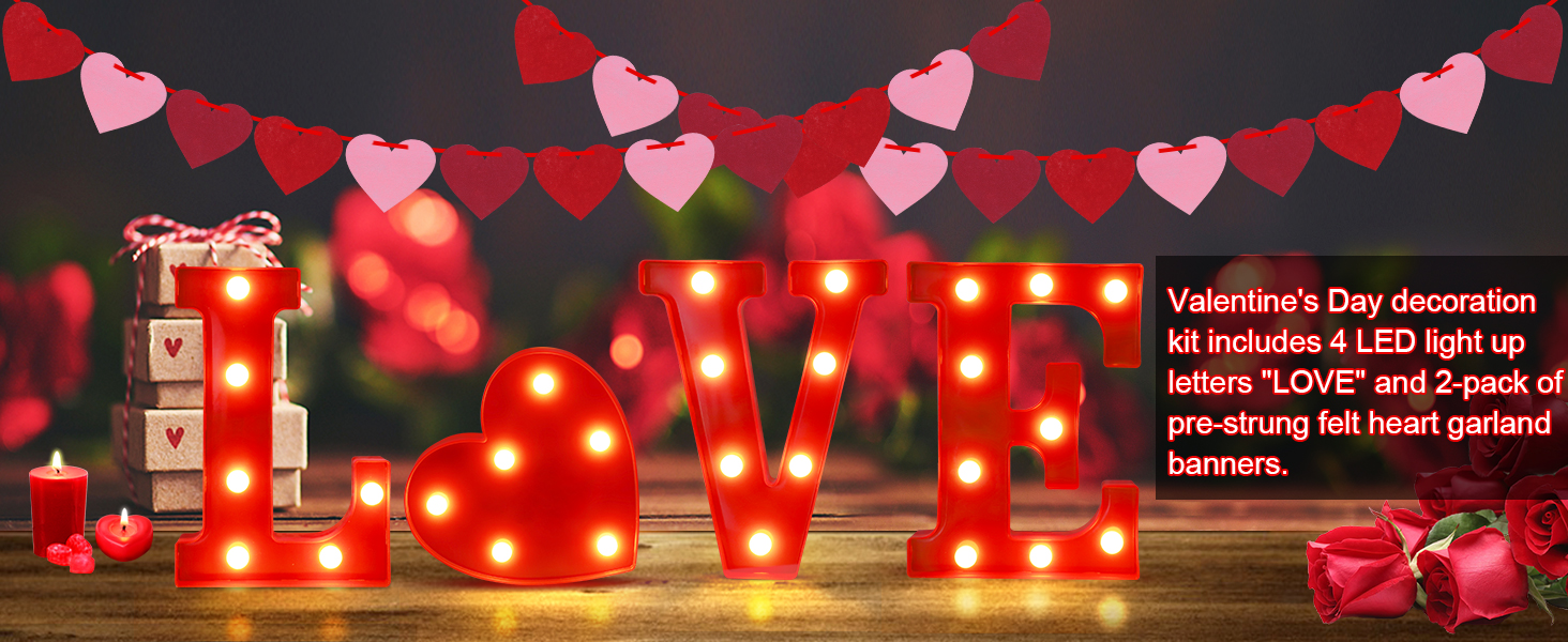 Valentines Day Decor - These light up letter “LOVE” lights and felt heart garland banner are a good choices for valentine day decor, valentines party decorations, valentines decorations for home indoor/outdoor, living room, bedroom, kitchen, table, fireplace, mantel, shelf and any other place. It also can be as valentines gifts for you lover, family, etc.