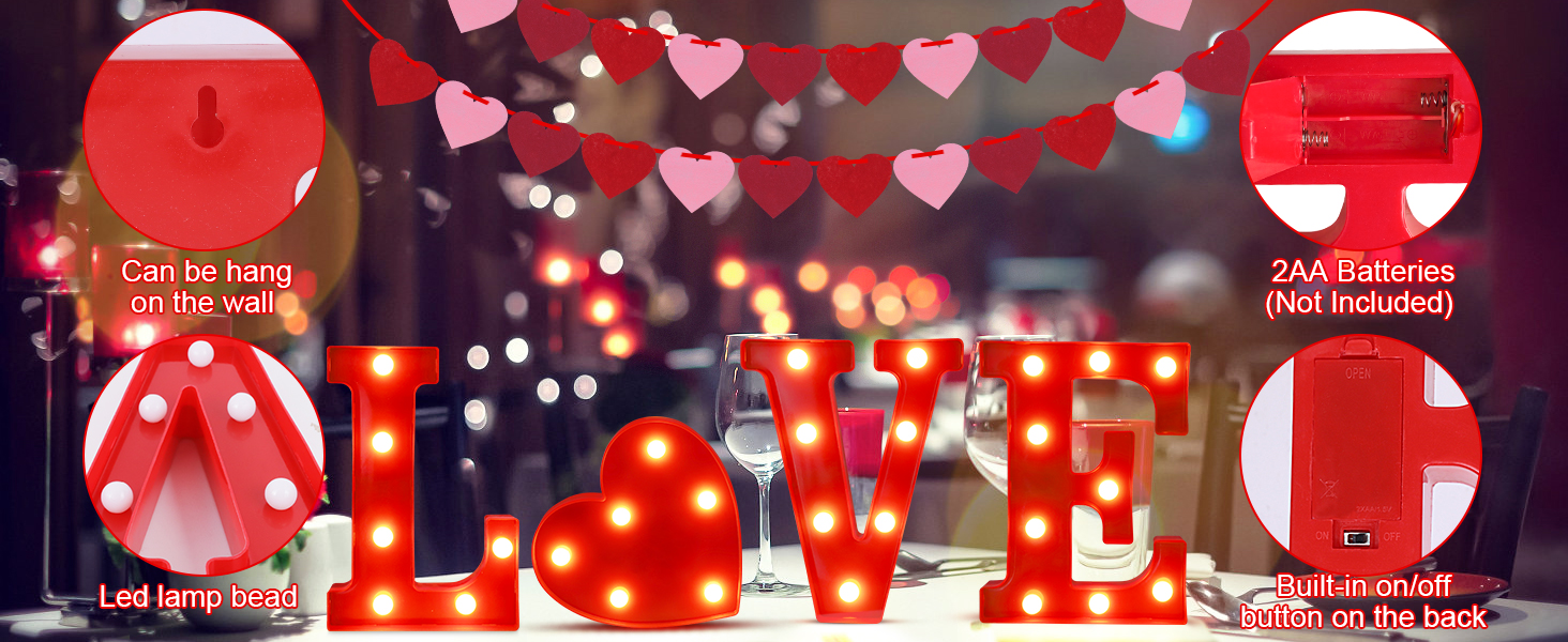 How to Use - These valentines light up letters “LOVE” lights have holes and On/Off switches on the back, you can place them directly on the table as valentines day lights indoor table decorations, or hang them on the wall with some nails(not included). NOTE: Each letter requires 2 AA batteries for a total of 8 AA batteries (batteries not included).