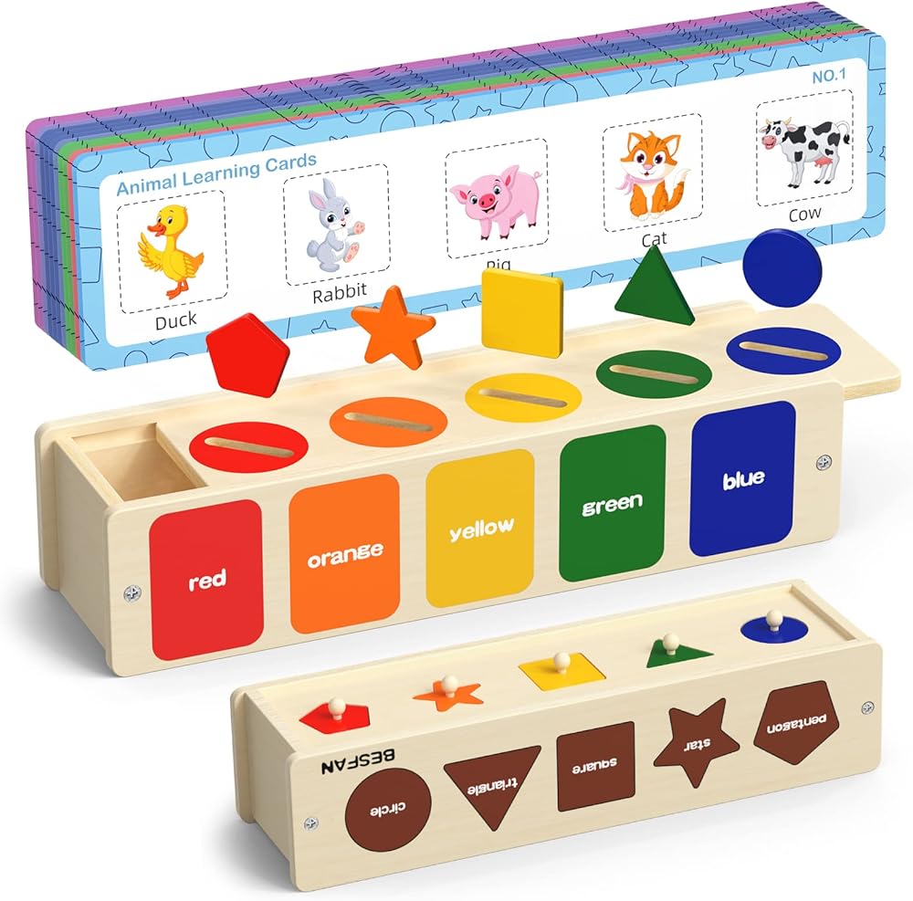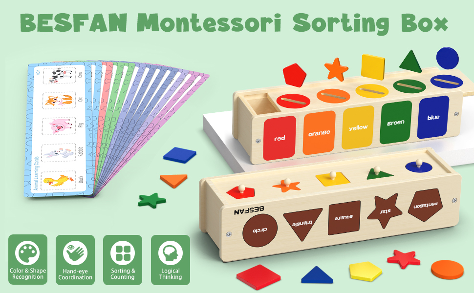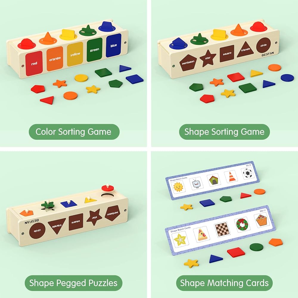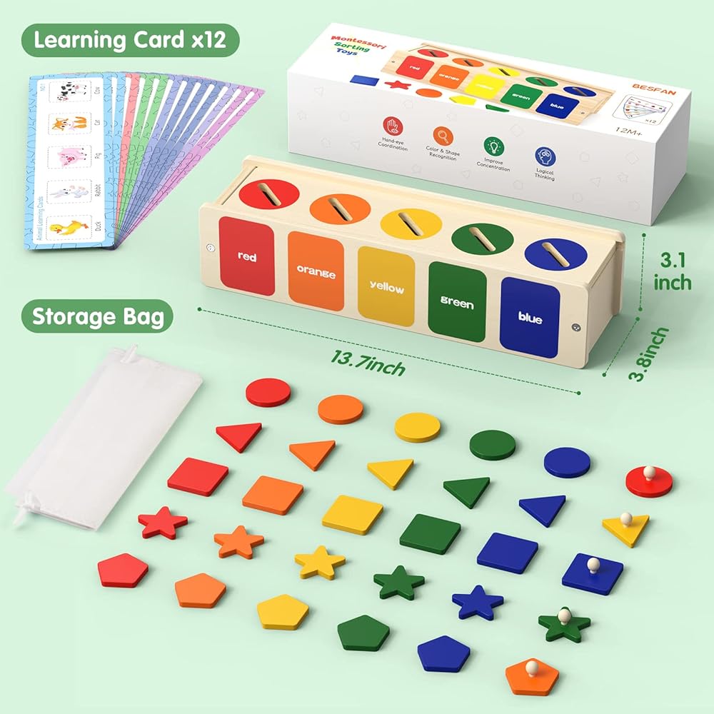 • ❤️【Montessori Sorting Toys for Toddlers】BESFAN Color & Shape Sorter Toys are designed for 1-3 years old toddlers, including a wooden sorting box, 25 shaped wooden blocks, 5 pegged puzzles and 12 learning cards. Based on Dr. Maria Montessori's Theory, this toy is designed to promote children's sensory and brain development by self-directed activity and hands-on learning.