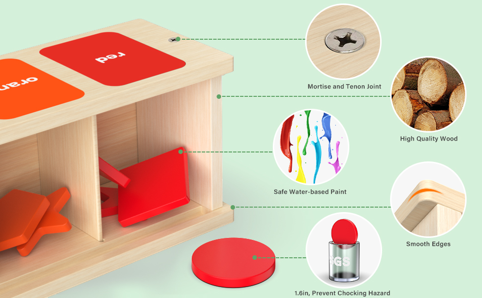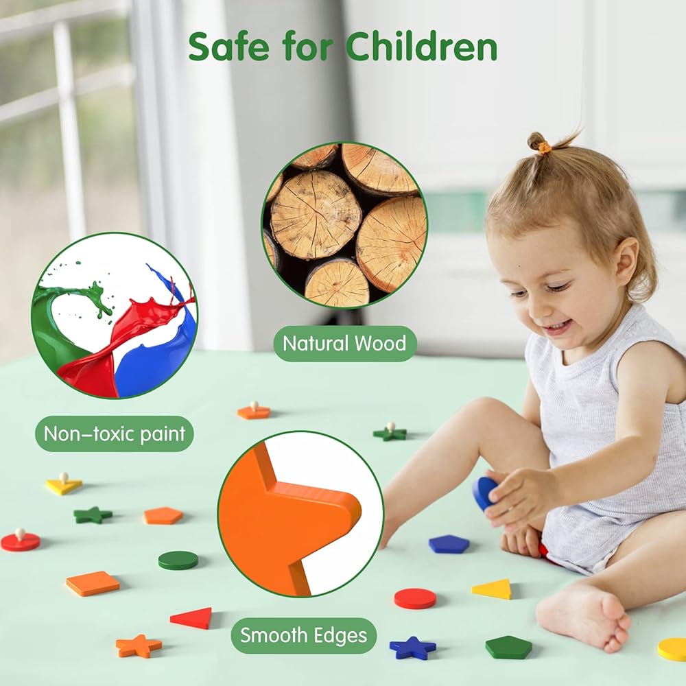 • 💙【SAFE for Children】Shape & Color Sorting Toys are made of natural wood and Non-toxic water-based paint, strong and durable with smooth edges and vivid color, BPA free, SAFE for children. The size of each wooden block is 1.6in, passed SGS safety test, no choking hazard.