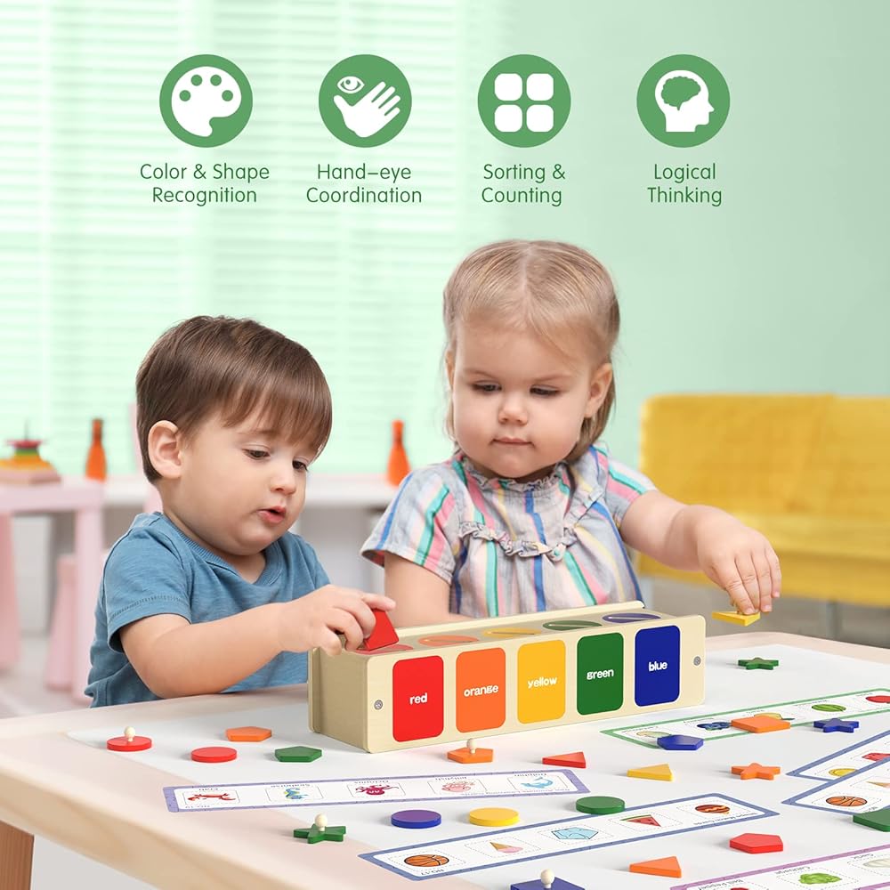 • 💚【Simple & Fun 3-in-1 Learning toy】Learning Shape, Color, Counting -- Develop baby's shape and color recognition by shape sorting games and color matching games. Parents can also use wooden blocks to teach kid counting, or use blocks to create different patterns to stimulate children's imagination. The bottom of this upgraded box provides pegged puzzles for more fun!