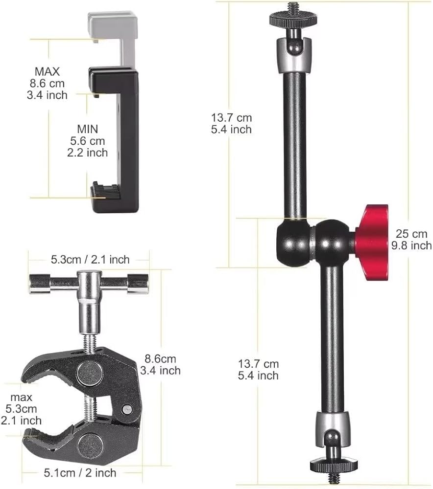 متعددة الوظائف: يأتي المشبك الفائق مع خيط قياسي 1/4 بوصة و3/8 بوصة يمكن تركيبه على أي أنبوب أو حامل ثلاثي القوائم، ثابت وقوي وأكثر تنوعًا لحمل شاشات الكاميرا، وأضواء LED والإكسسوارات الأخرى