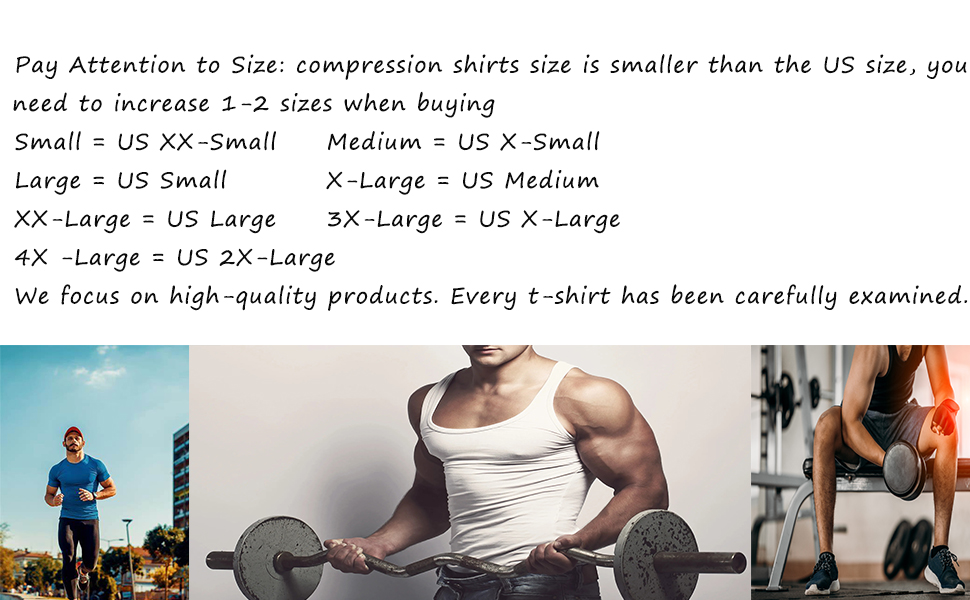• 1. انتبه إلى المقاس: مقاس القمصان الضاغطة أصغر من المقاس الأمريكي، تحتاج إلى زيادة مقاس 1-2 عند الشراء؛ صغير = مقاس XX-Small في الولايات المتحدة؛ متوسط ​​= مقاس X-Small في الولايات المتحدة؛ كبير = صغير في الولايات المتحدة؛ X-Large = مقاس متوسط ​​في الولايات المتحدة؛ XX-Large = مقاس كبير في الولايات المتحدة؛ 3X-Large = مقاس X-Large في الولايات المتحدة؛ 4X-Large = 2X-Large في الولايات المتحدة. يرجى الرجوع إلى قاعدة المقاسات هذه لاختيار مقاسك الصحيح.