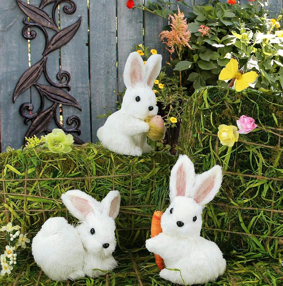 مجموعة من 3 تماثيل موسمية قابلة للتجميع من نيتشر فايب، أرانب السيزال البيضاء مصنوعة يدويًا.