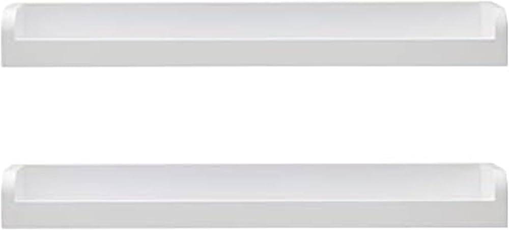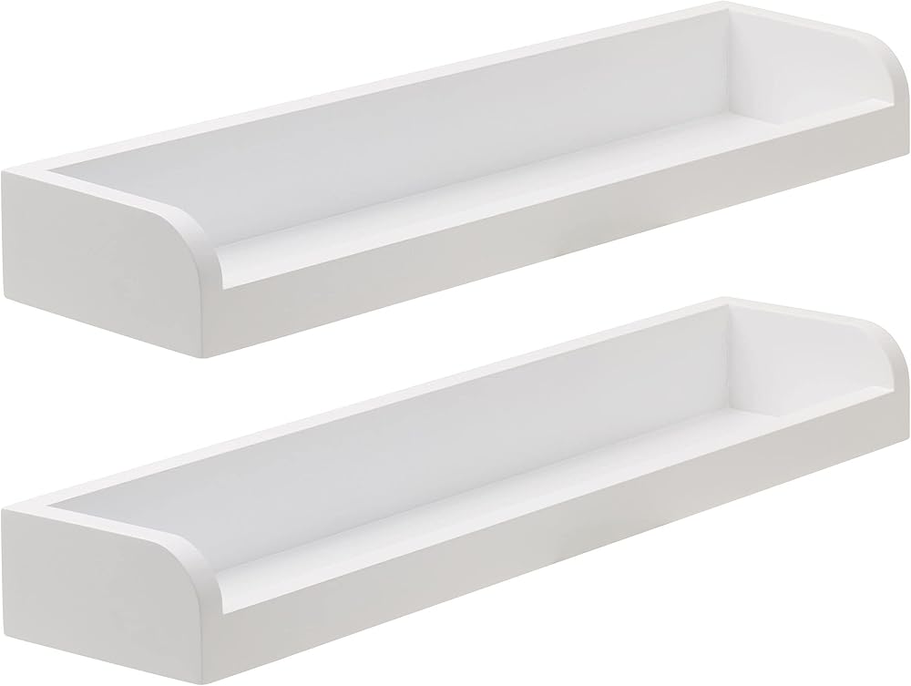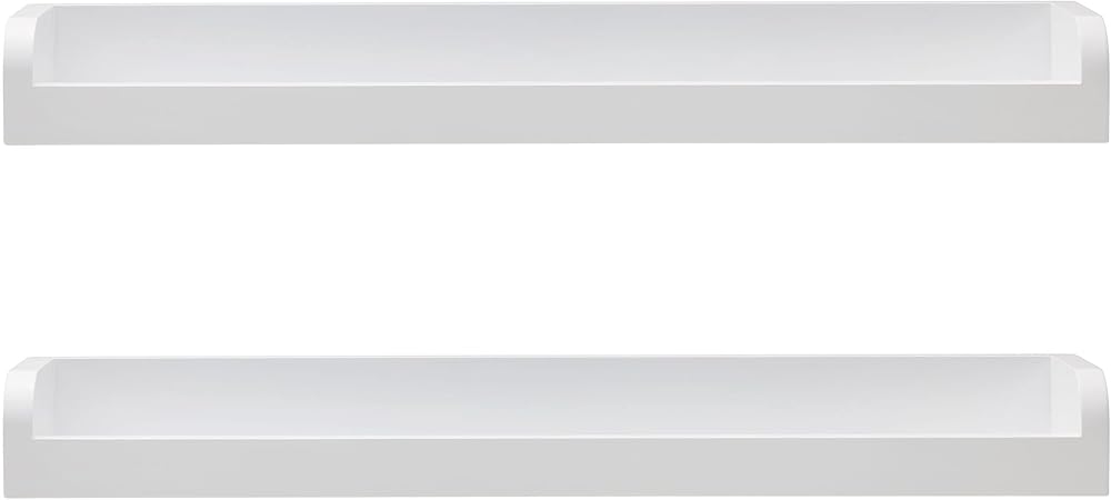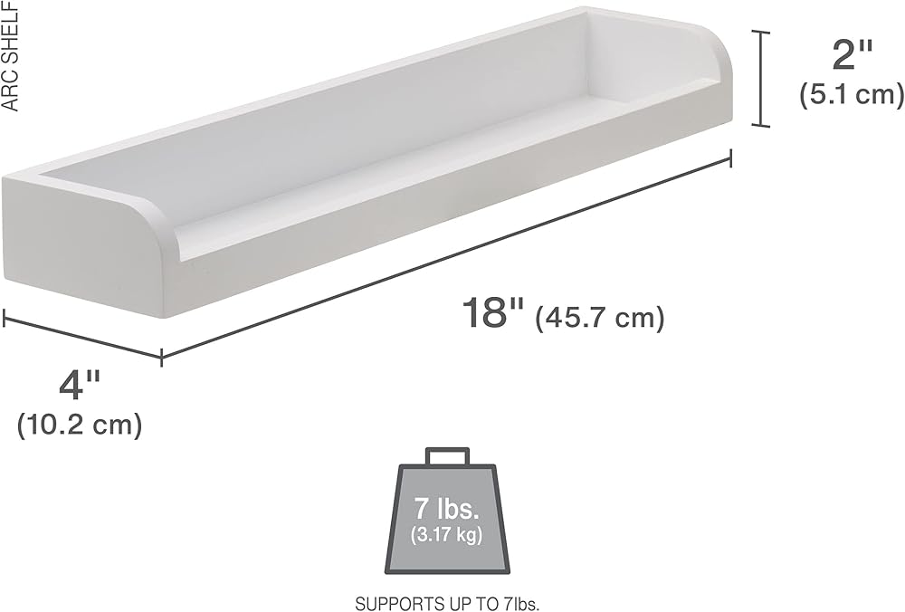 Decorate your home with this Set of 2 White Melannco Floating Arc Wall Shelves for Nursery, Bedroom, Living Room, and Kitchen. This set includes two 18-inch wall shelves that each hold up to 7 pounds. Perfect for displaying picture frames, vases, books, knickknacks, and more. These versatile shelves feature a raised edge that keeps items securely in place. The sleek design and elegant, white finish will complement any decor. Set includes hardware, instructions, and anchors with a template and a level for easy hanging. Create your own display by hanging shelves together or separately for a customized look. Measures 18 x 4 x 2 inches each.
